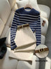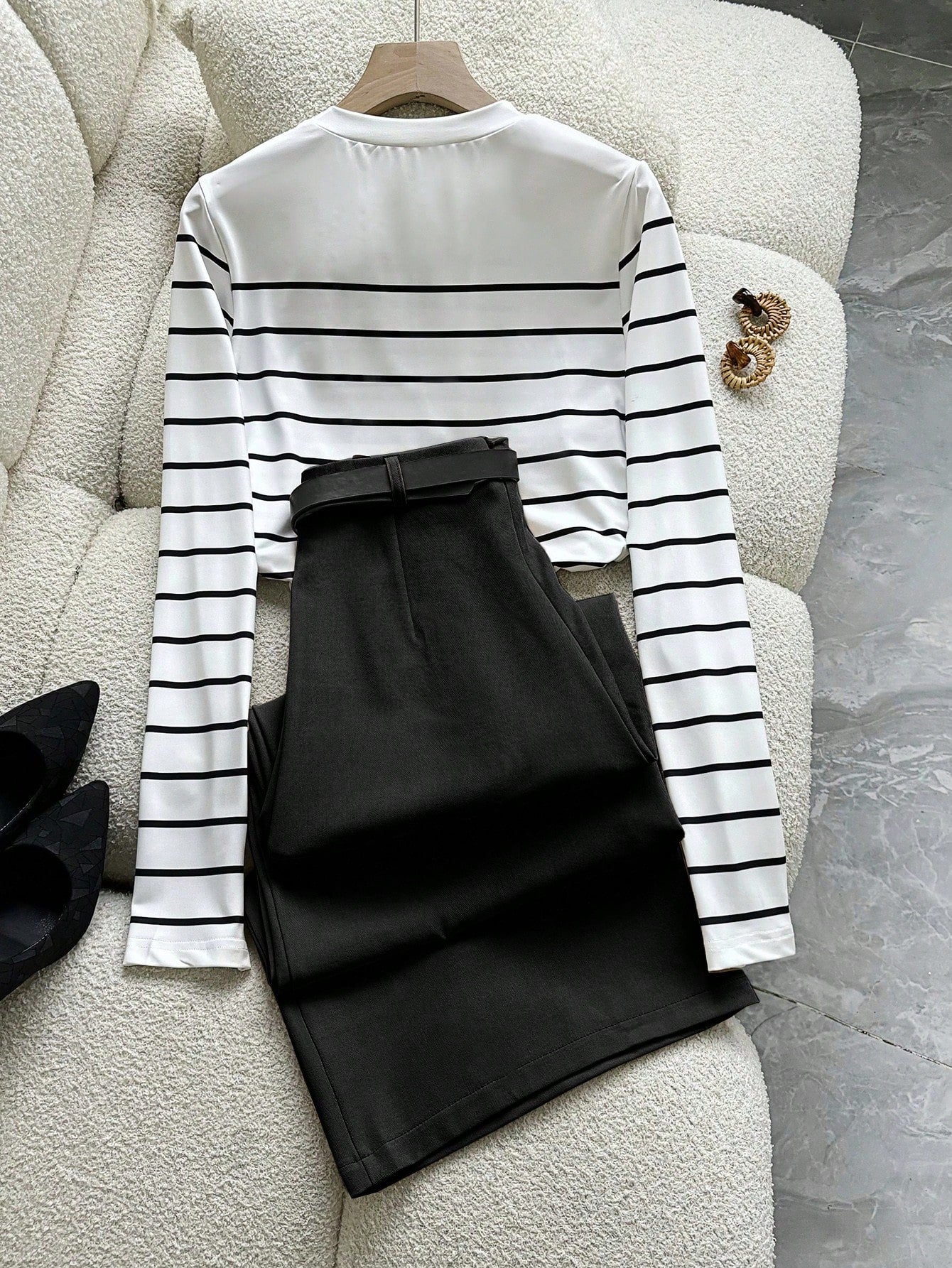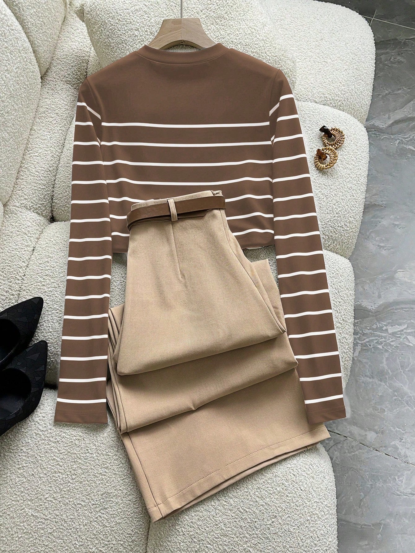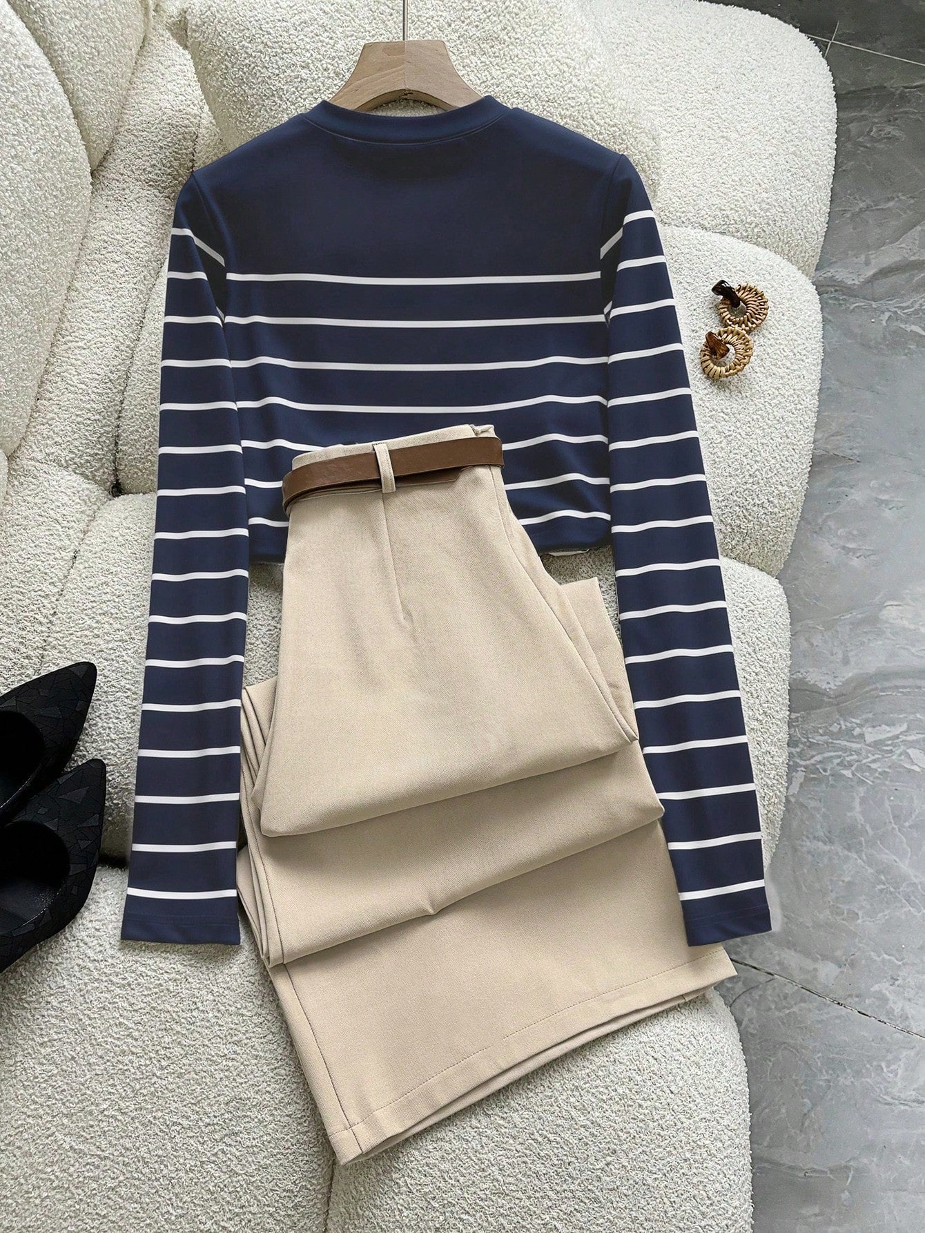 2pcs Commuter Elegant Striped Long Sleeve T-Shirt And Pants