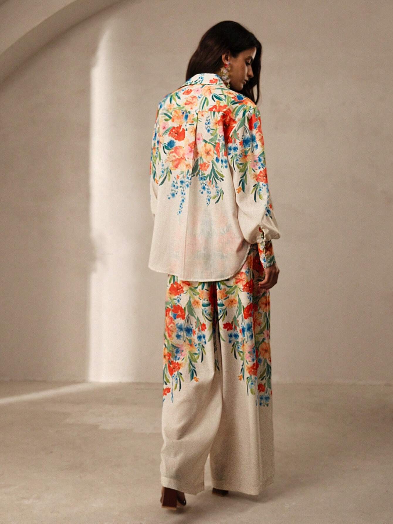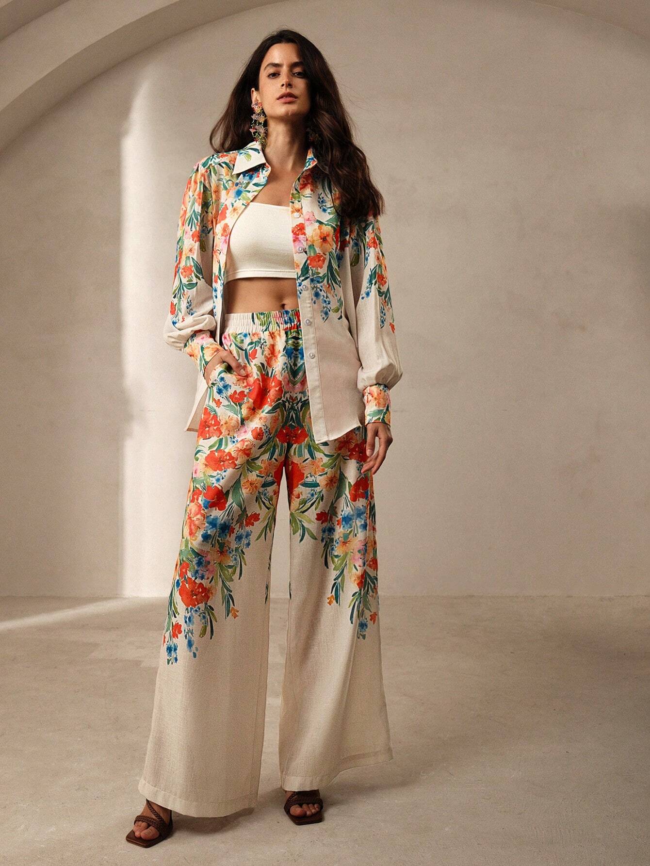 Anewsta 2pcs Floral Printed Ladies' Shirt And Pants Set