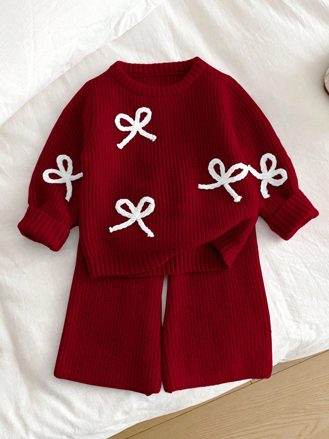 Baby Girl Fashion Versatile Cute Casual Bow Decor Sweater & Knit Pants