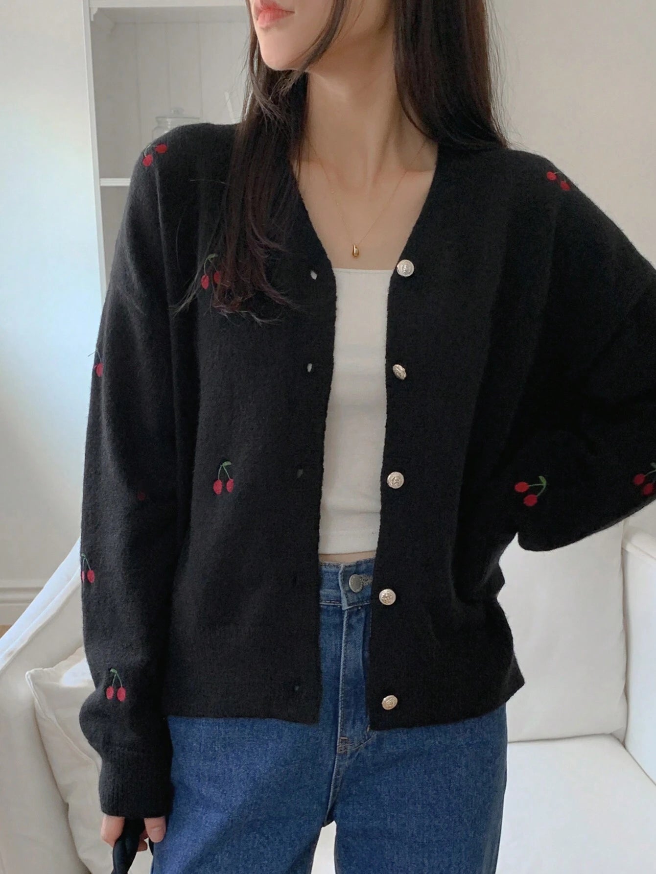 DAZY Cherry Embroidery Drop Shoulder Cardigan