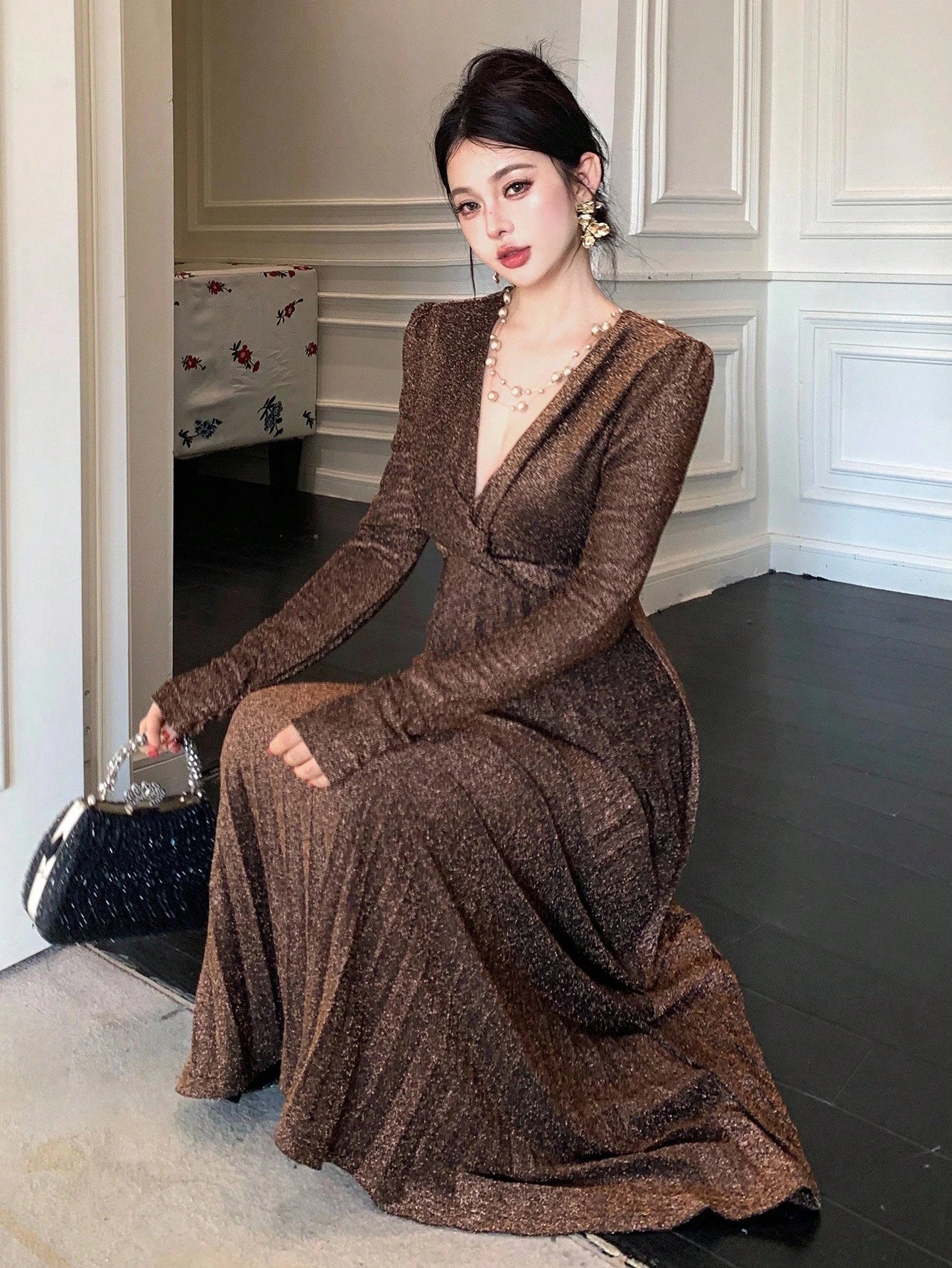 DAZY Elegant V-Neck Cinched Waist Luxury Party Dress