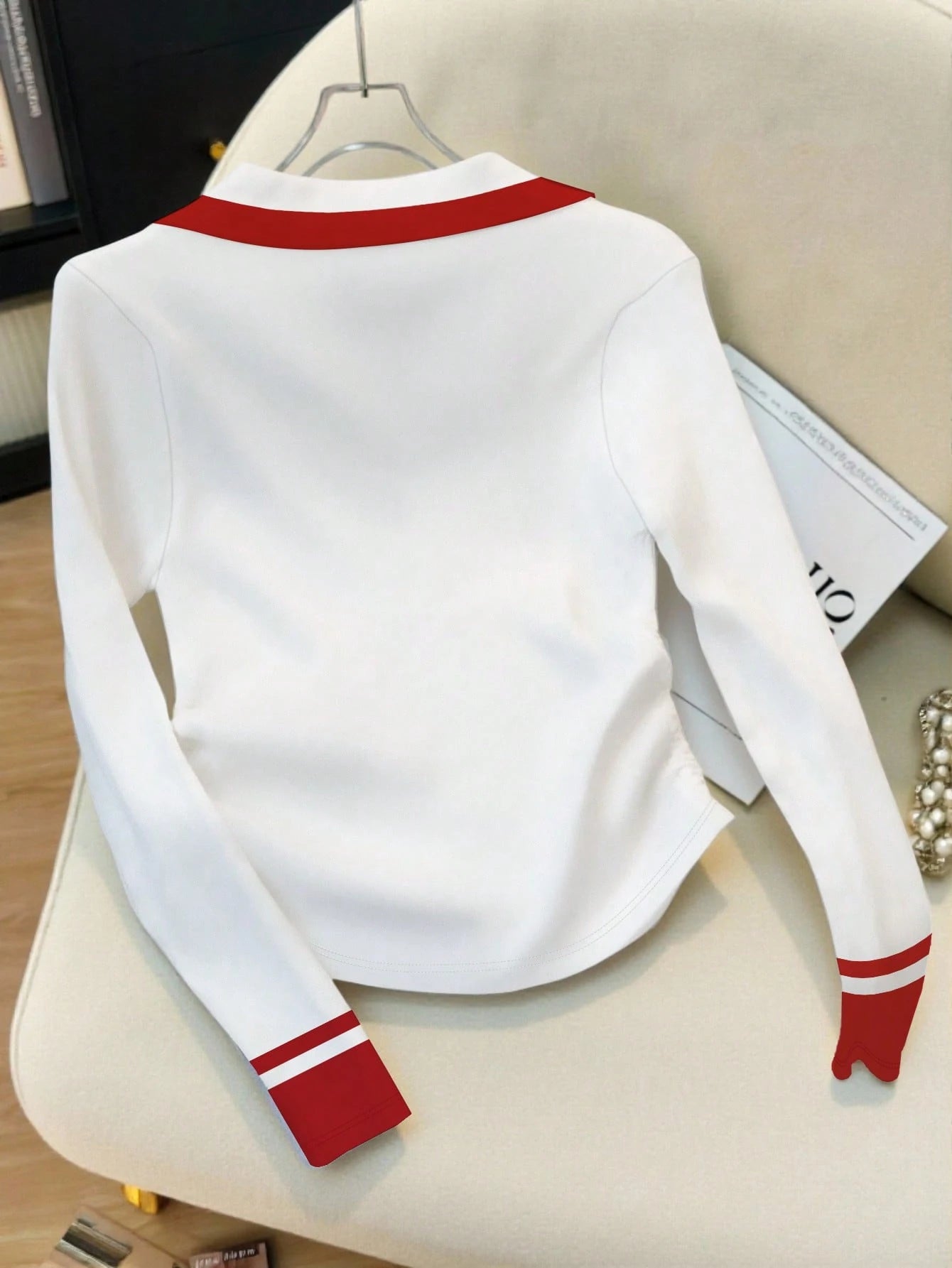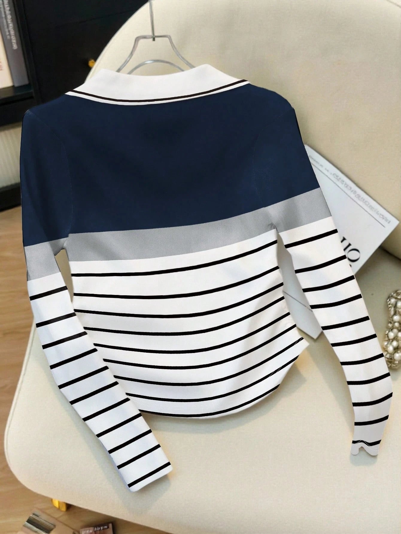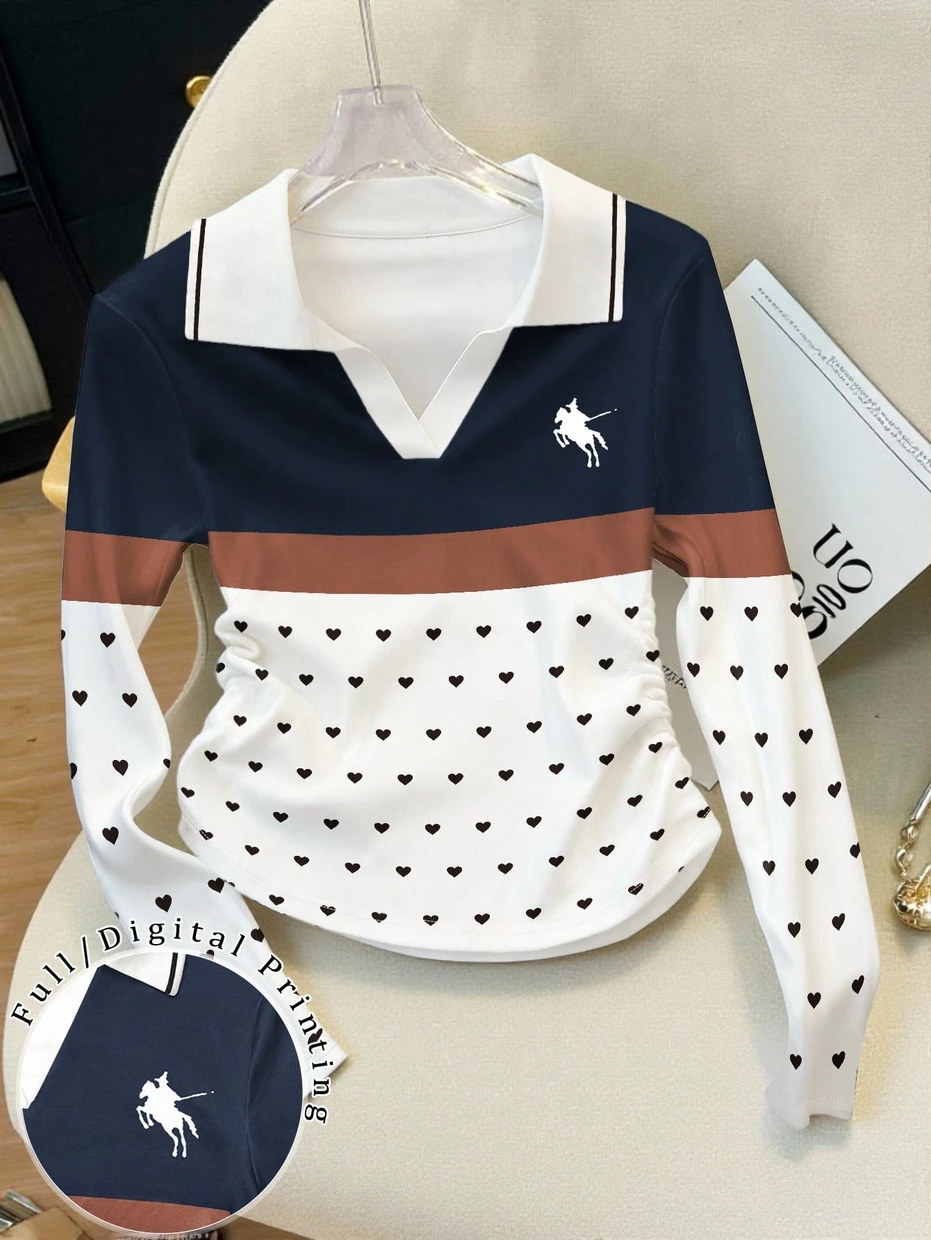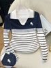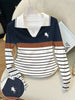 Elegant Color-Blocked Polo Collar Women's Long-Sleeved T-Shirt