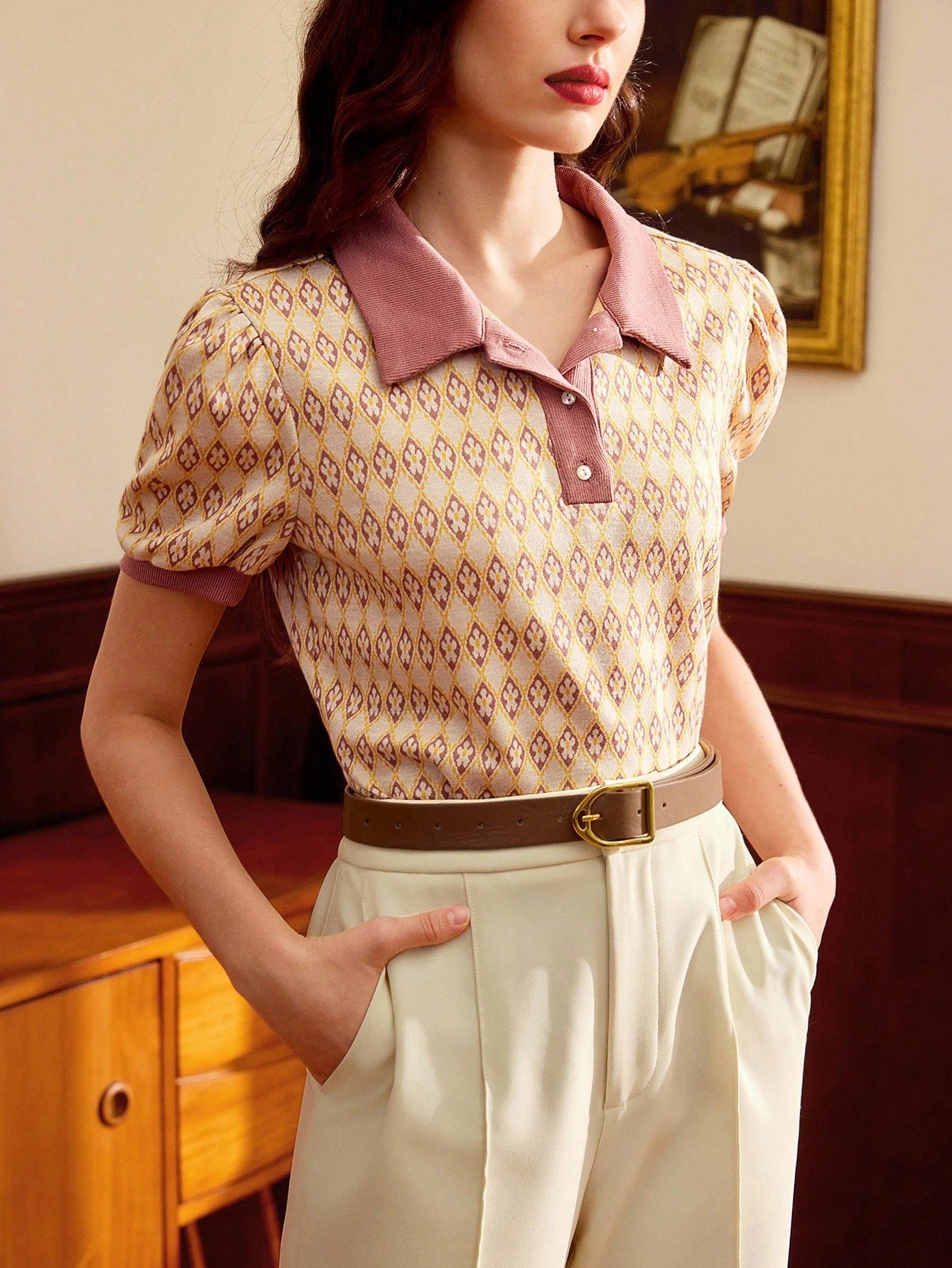 Elegant Women Polo Collar Jacquard Casual Commute Vacation T-Shirt