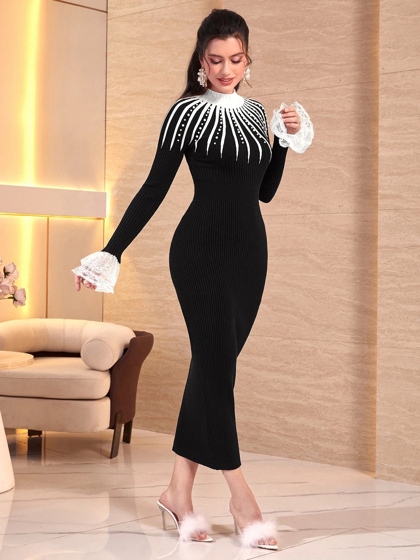 Modelyn Contrast Lace Flounce Sleeve Sweater Dress