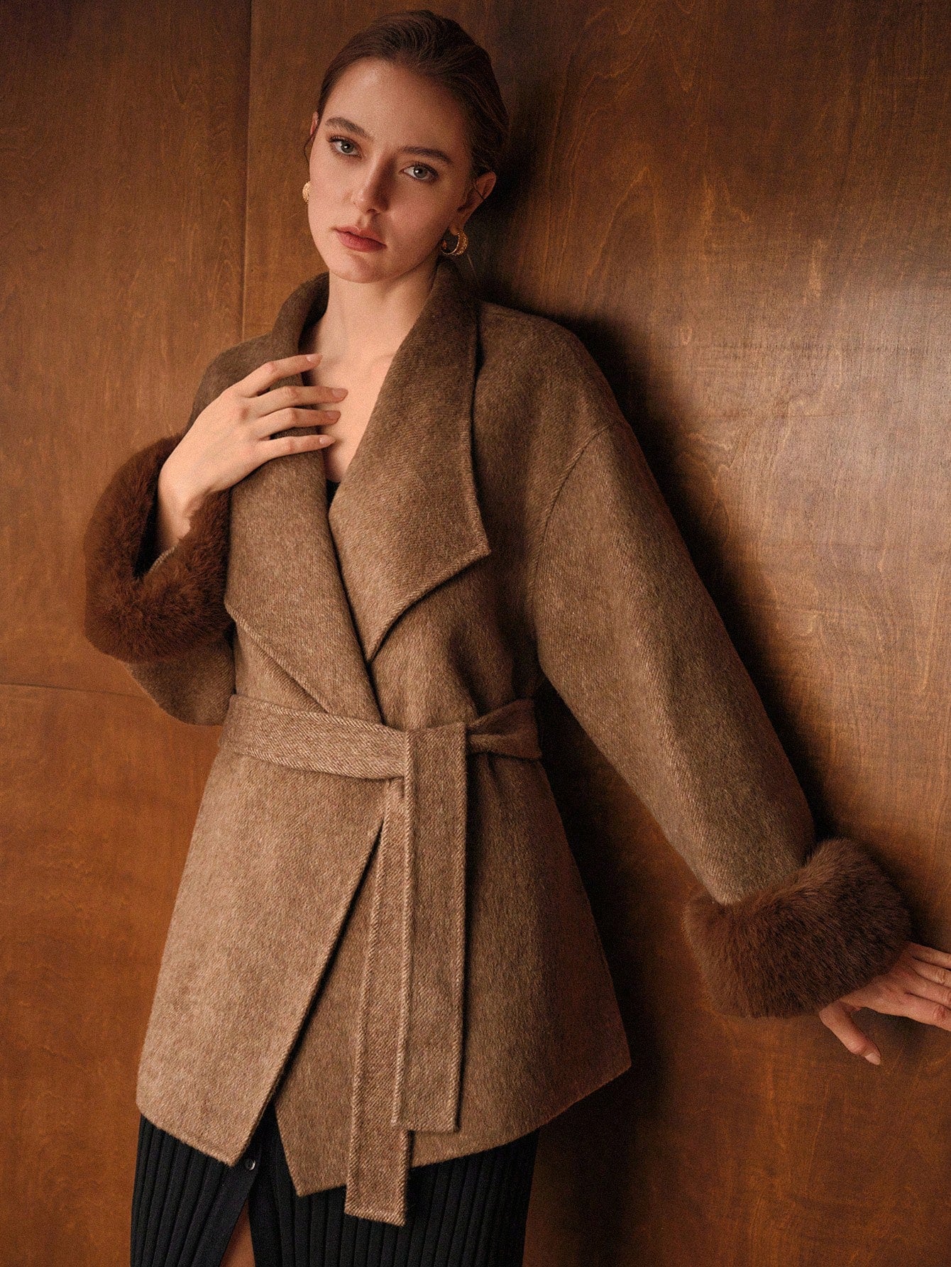 MOTF PREMIUM WOOL BELTED CONTRAST FAUX FUR OVERCOAT