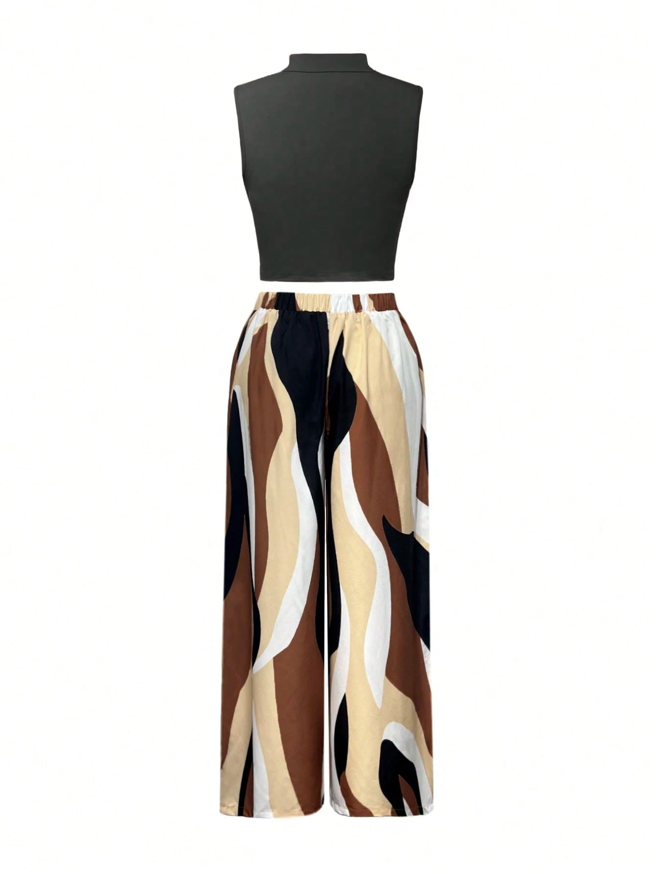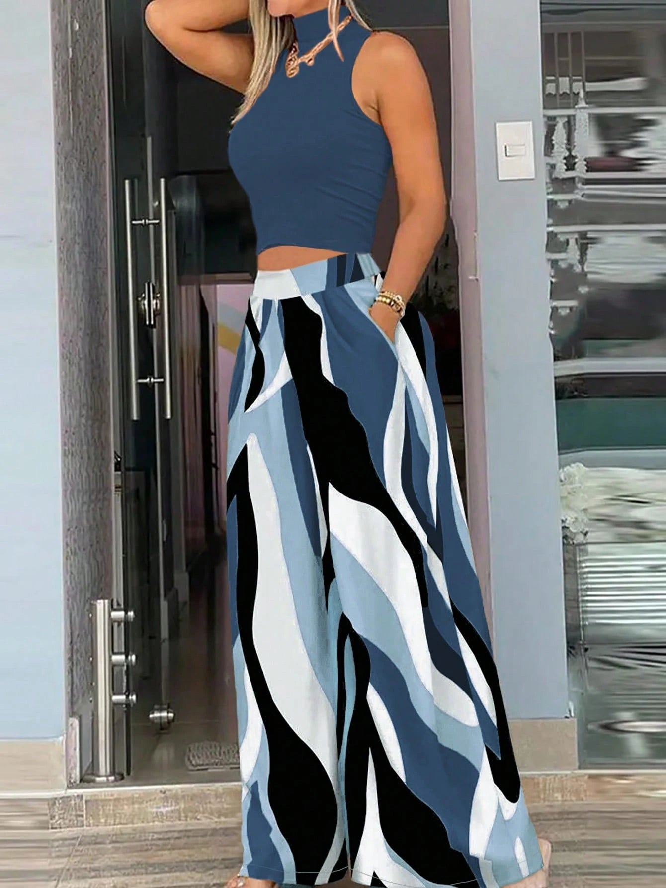 Ribbed Knit Mock Neck Sweater (Wavy Pattern) Paired With Wide Leg Woven Pant