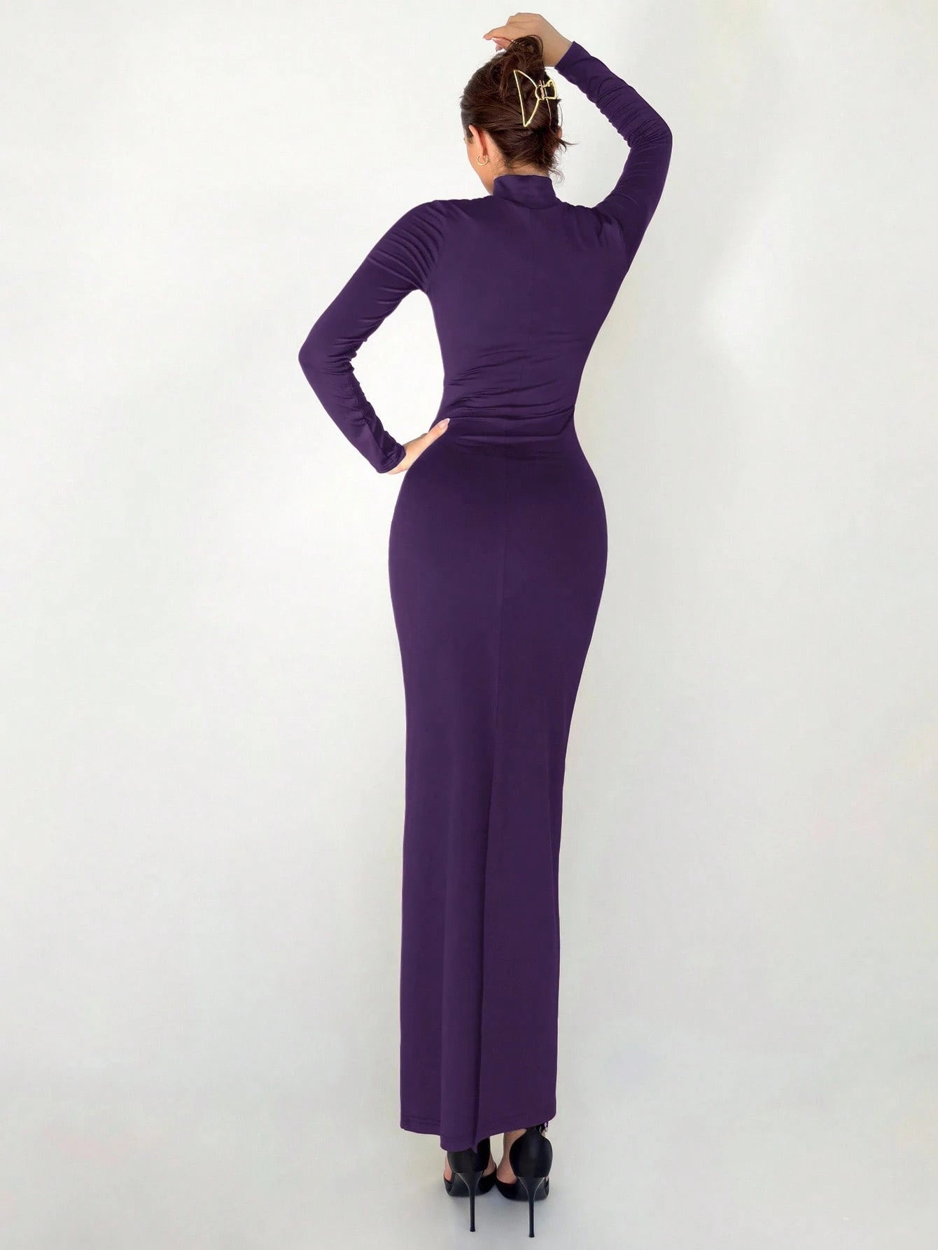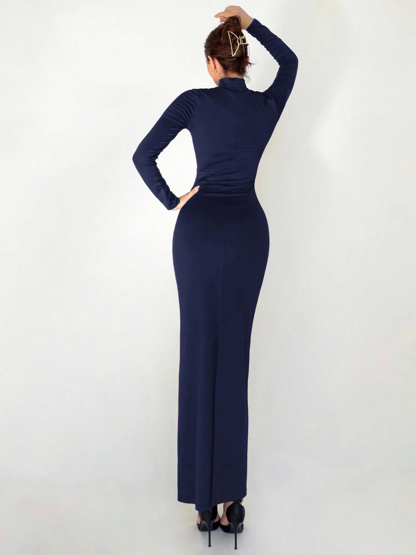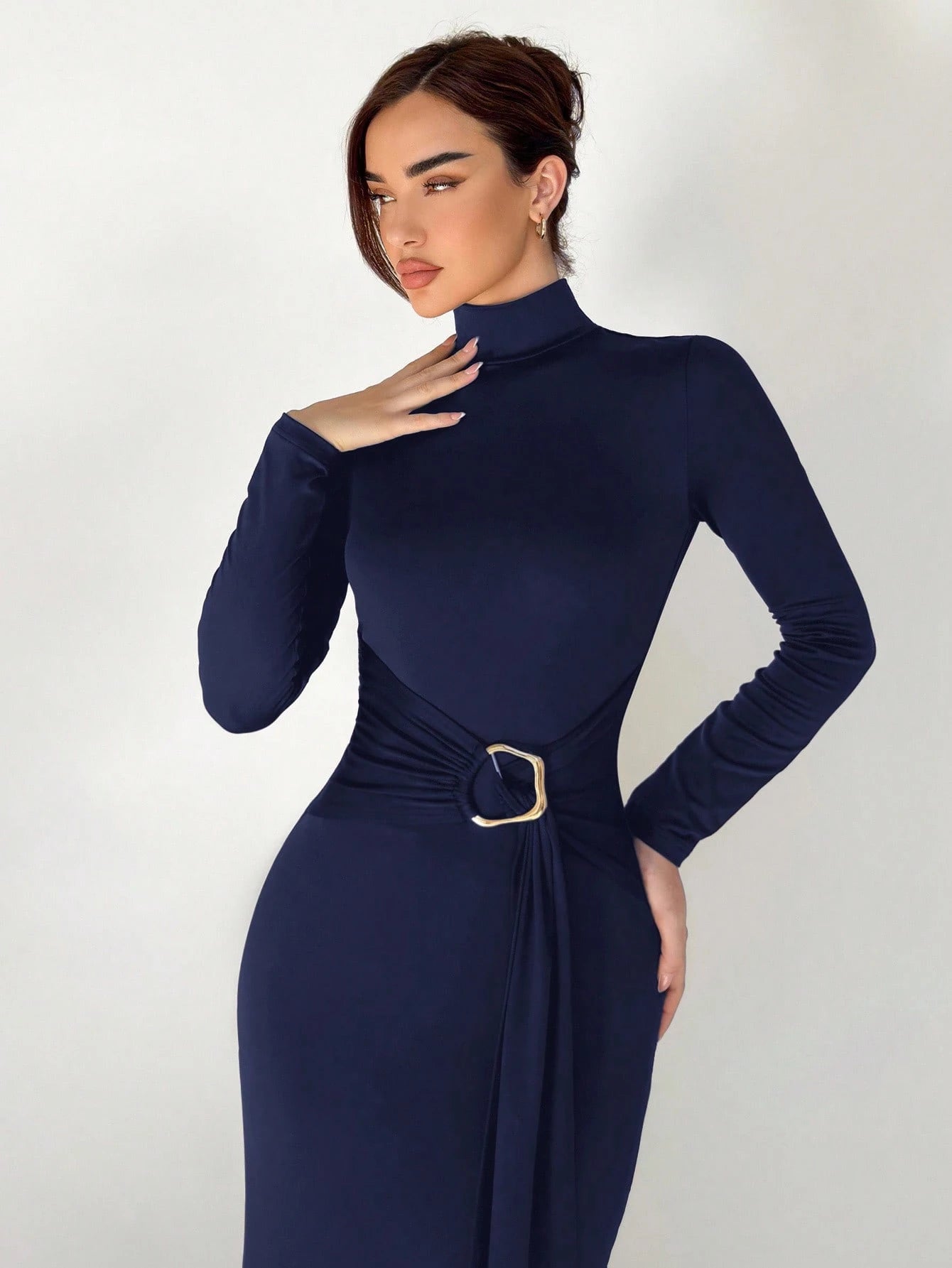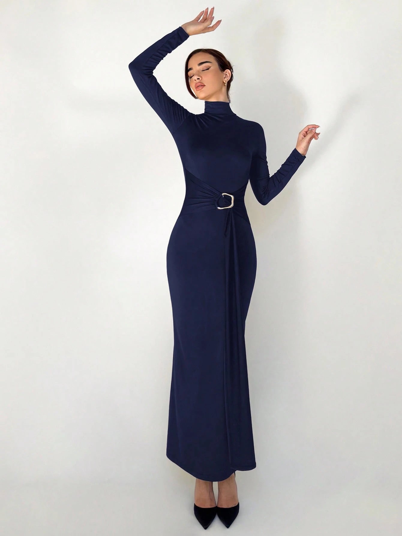 Slim Fit Warm Stand Collar Long Sleeve Cinched Waist Extra-Long Versatile Knit Dress