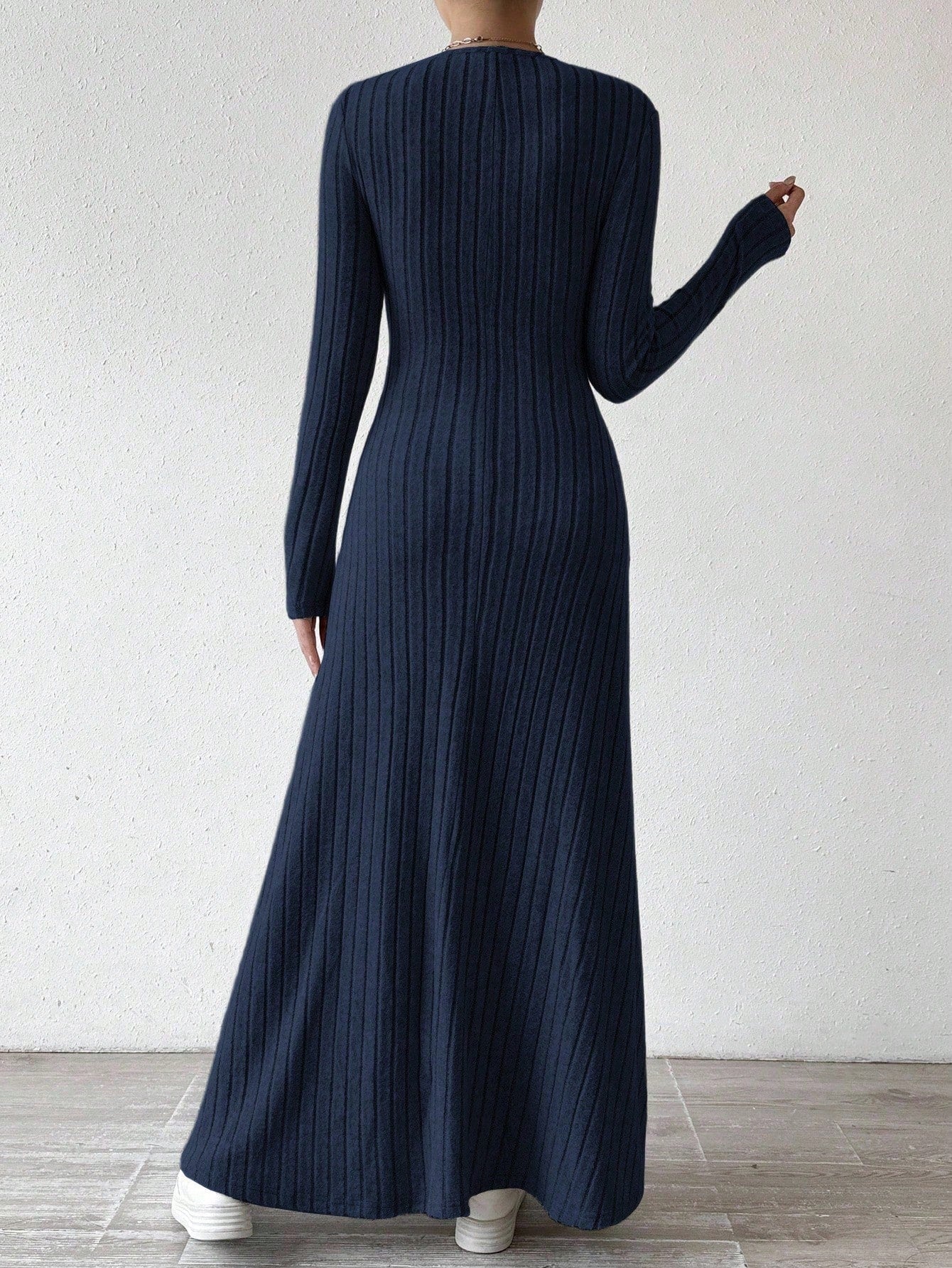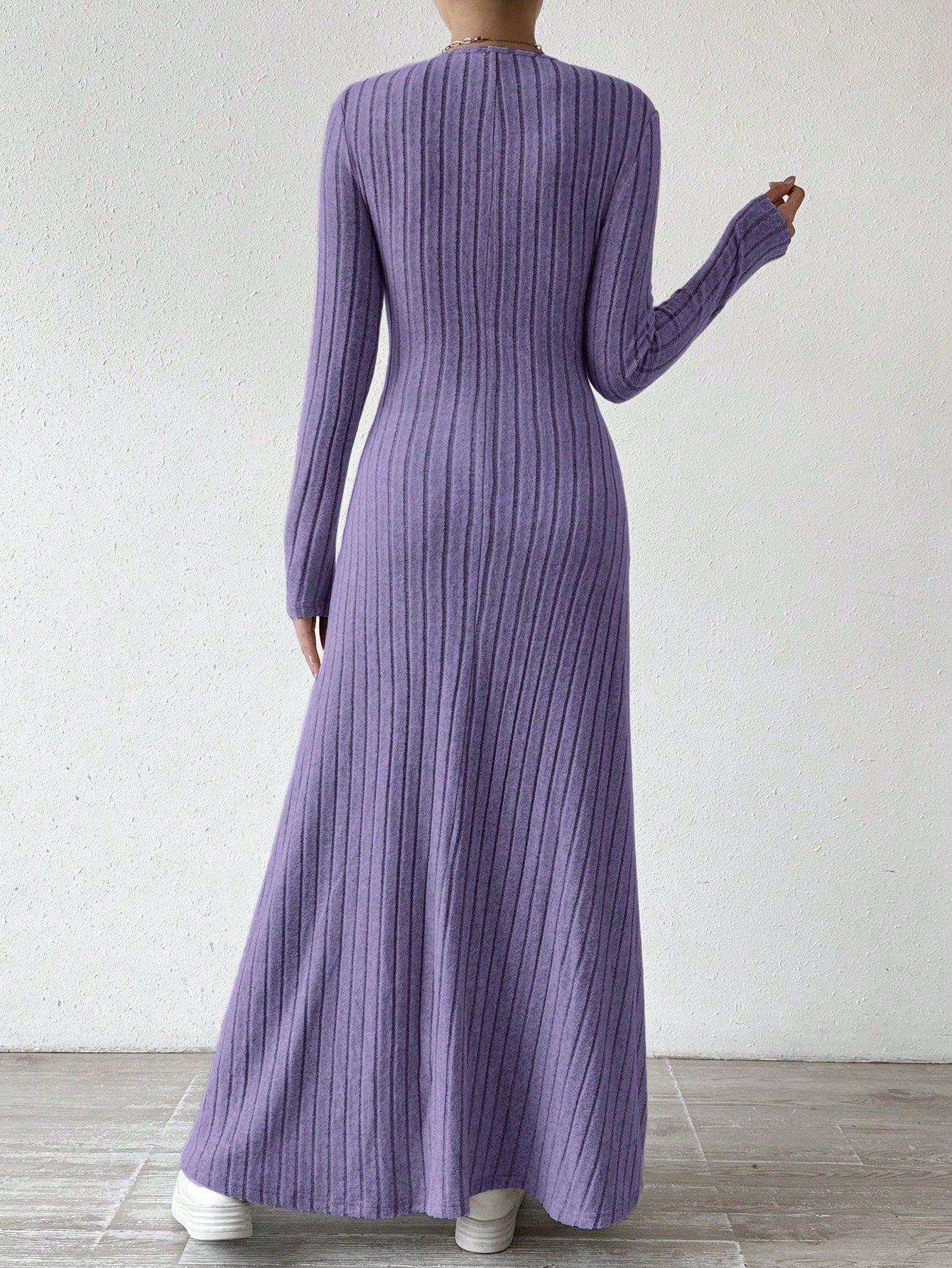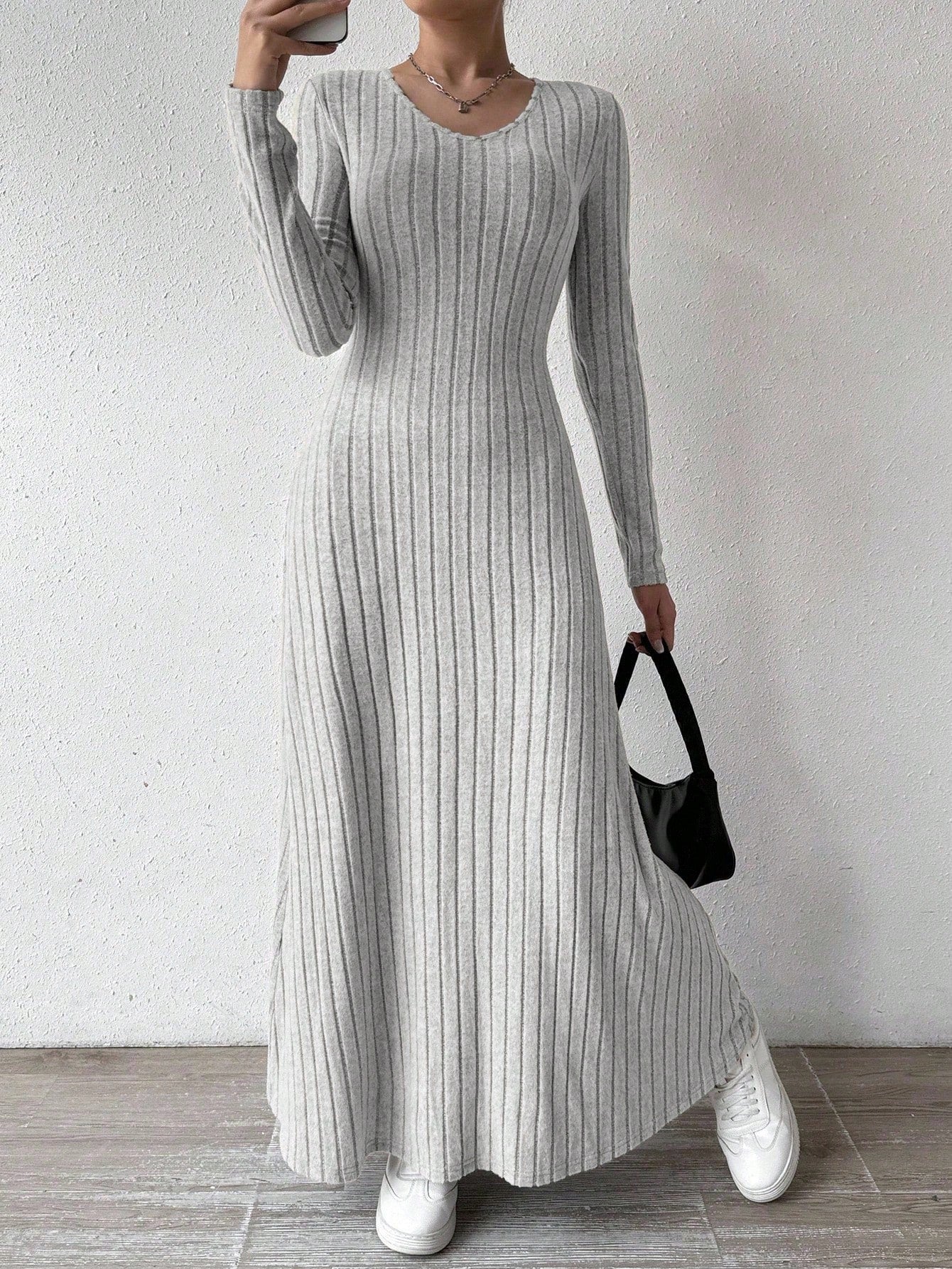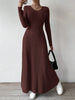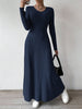 Solid Color V-Neck Knit Fleece Long Sleeve A-Line Dress