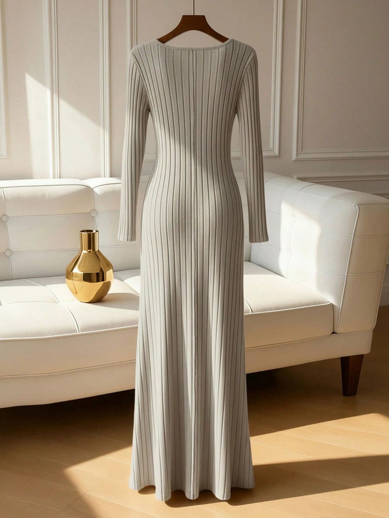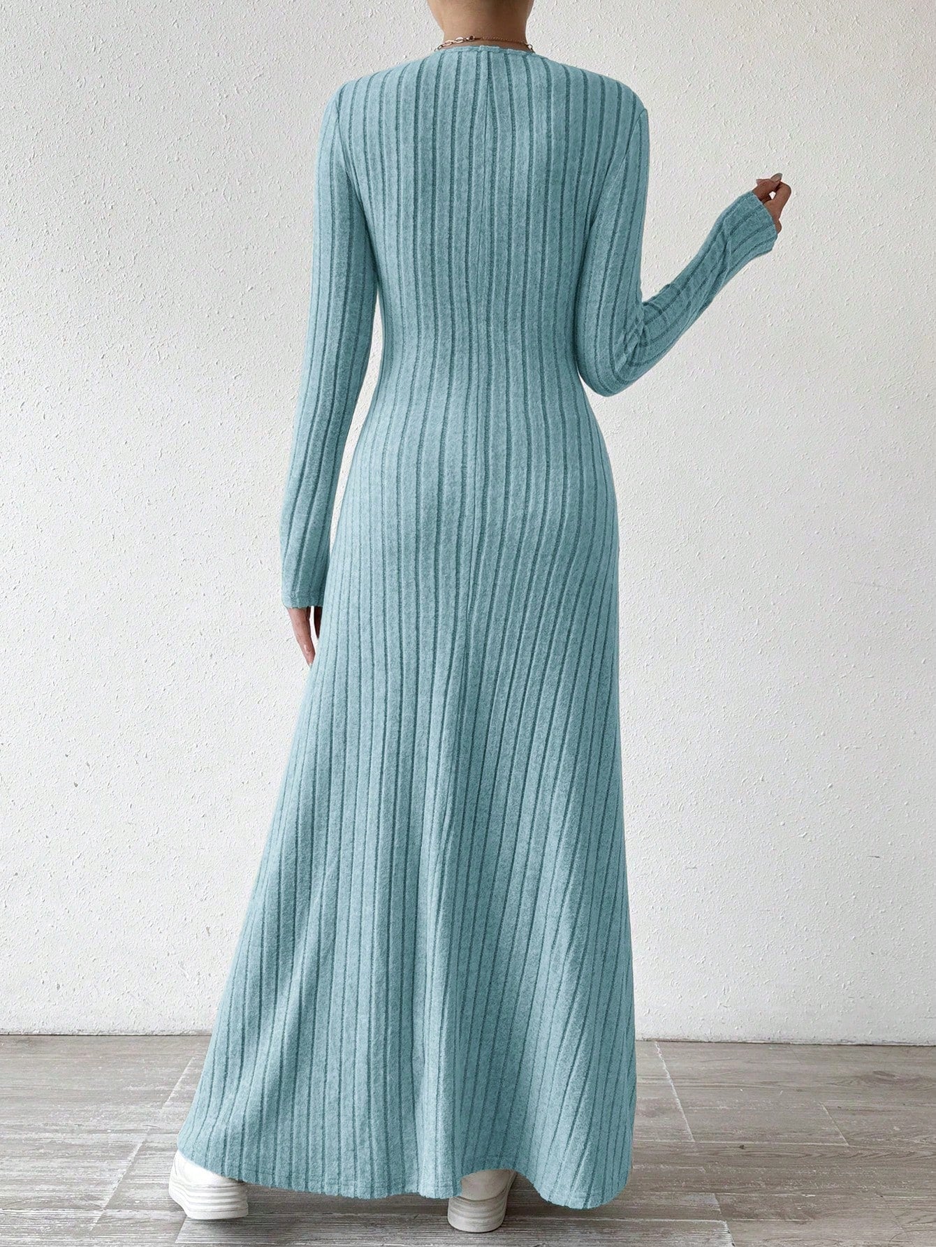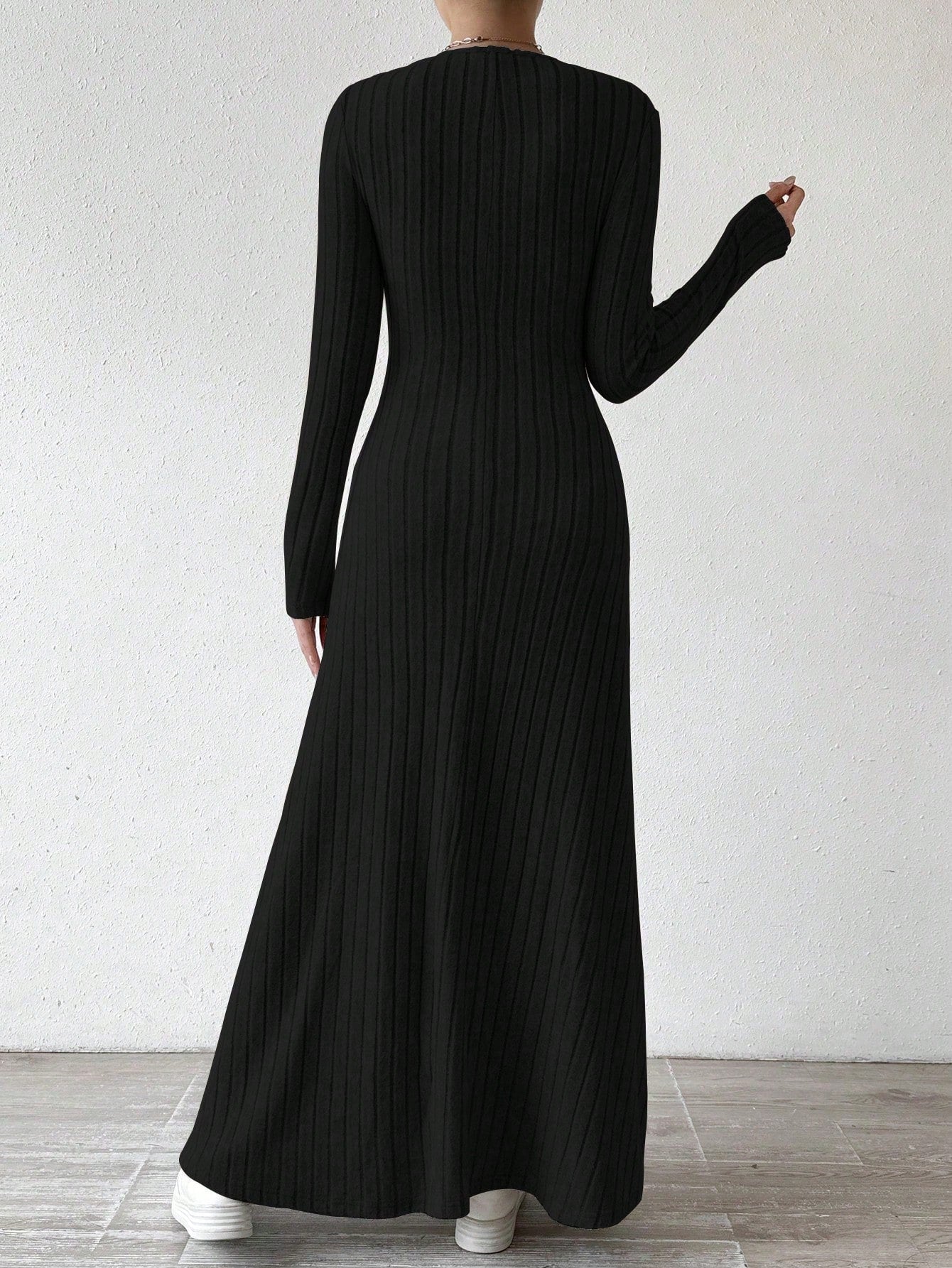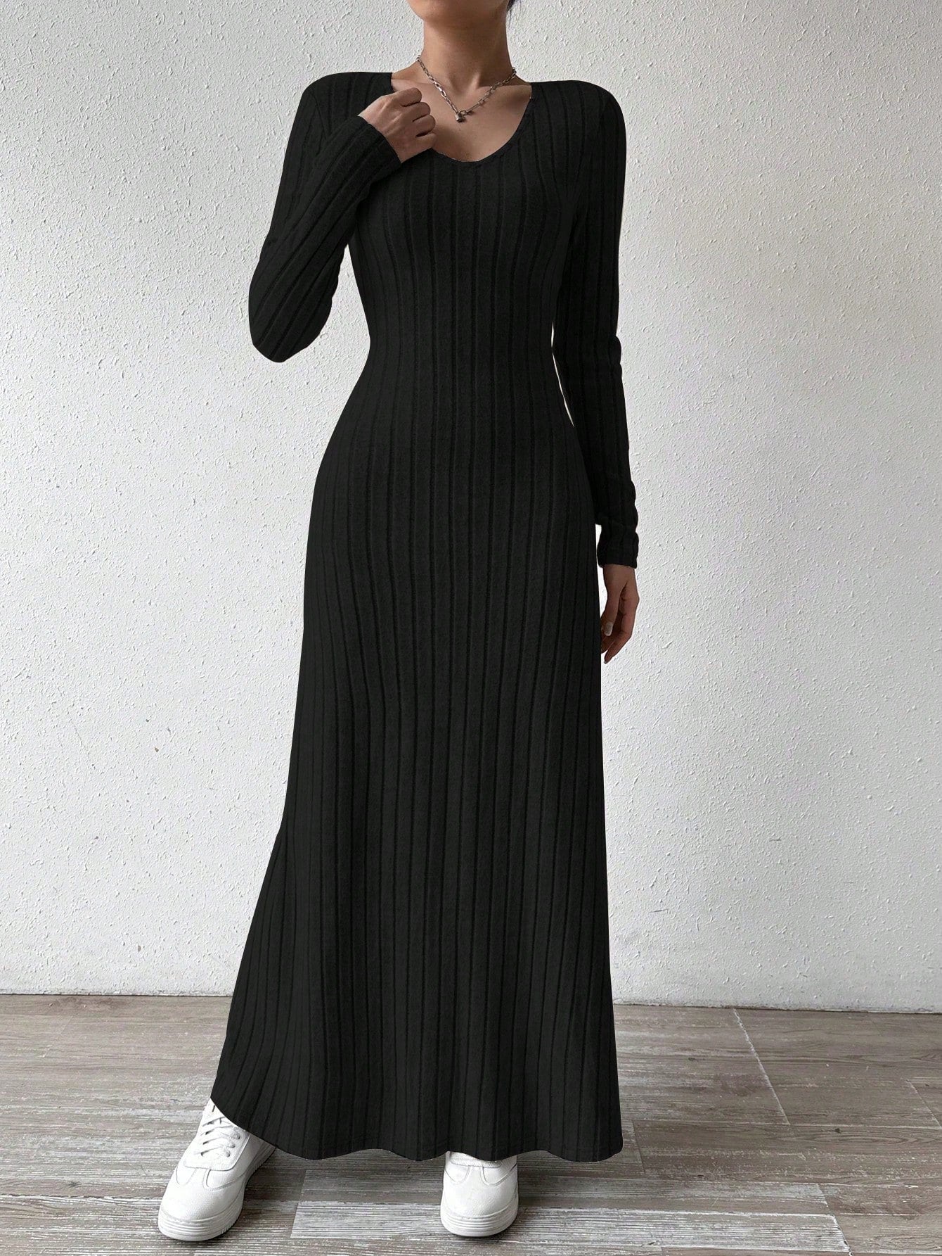Solid Color V-Neck Knit Fleece Long Sleeve A-Line Dress