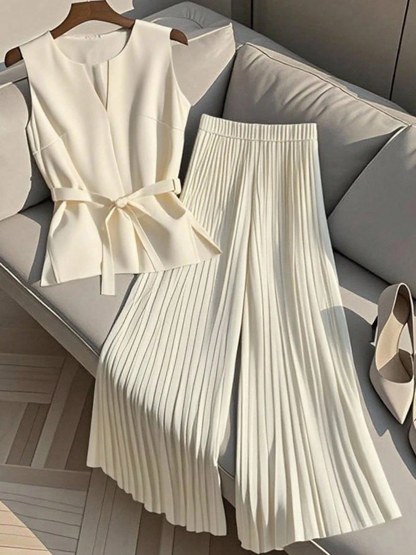Women Casual Sleeveless V-Neck Top & Pleated Elastic Waist Straight Leg Pants