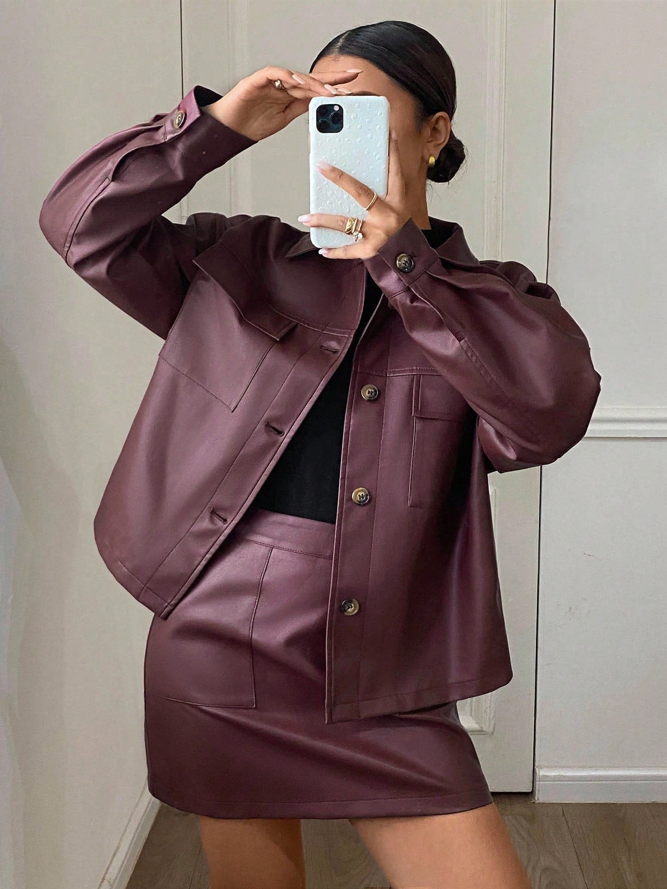 Women Solid Color Front Button Long Sleeve Pocket Blouse And A-Line Skirt