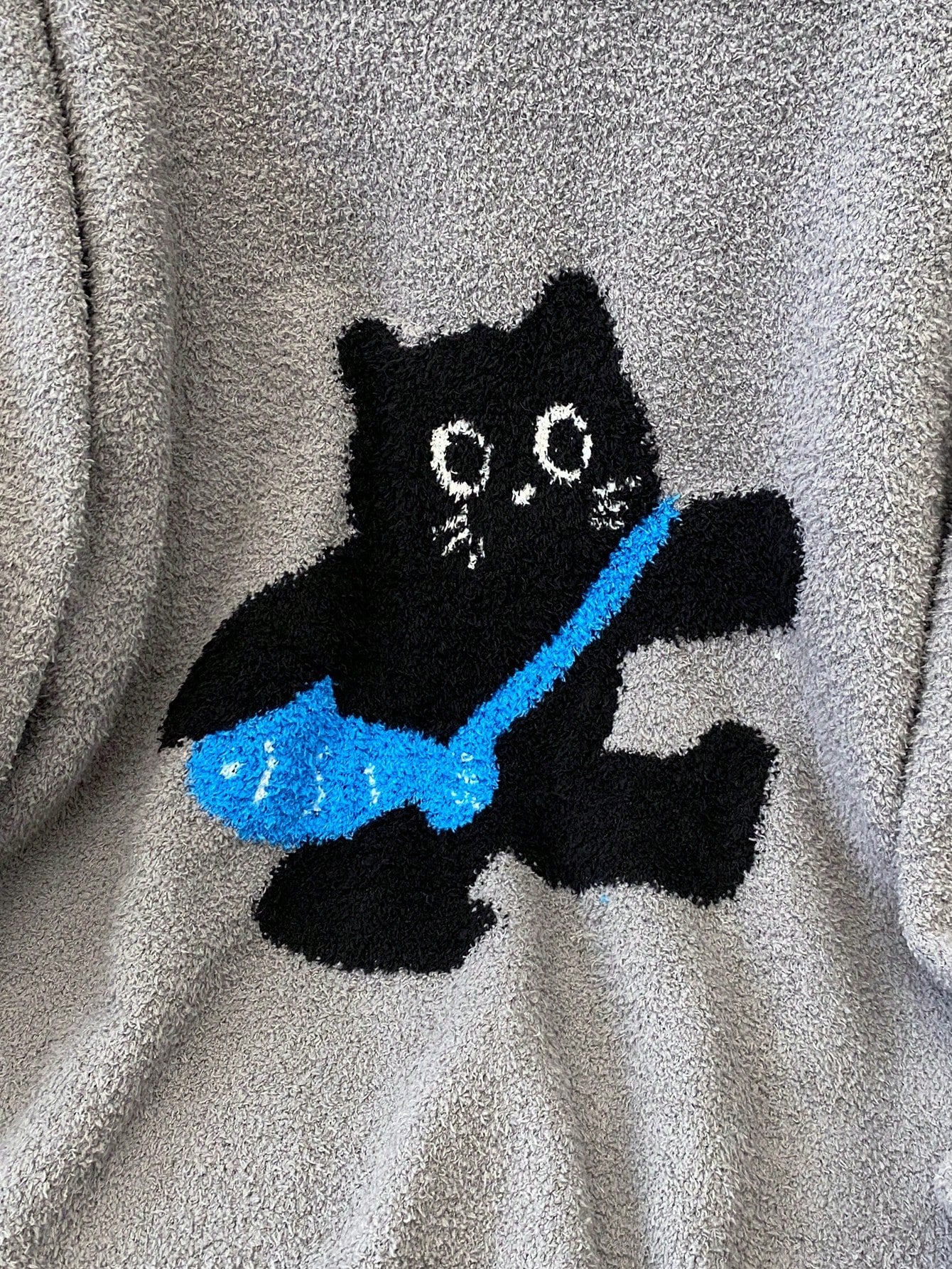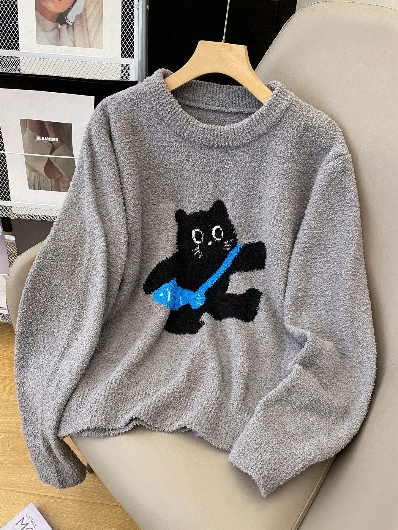 Women's Casual Cat Pattern Round Neck Drop Shoulder Long Sleeve Sweater