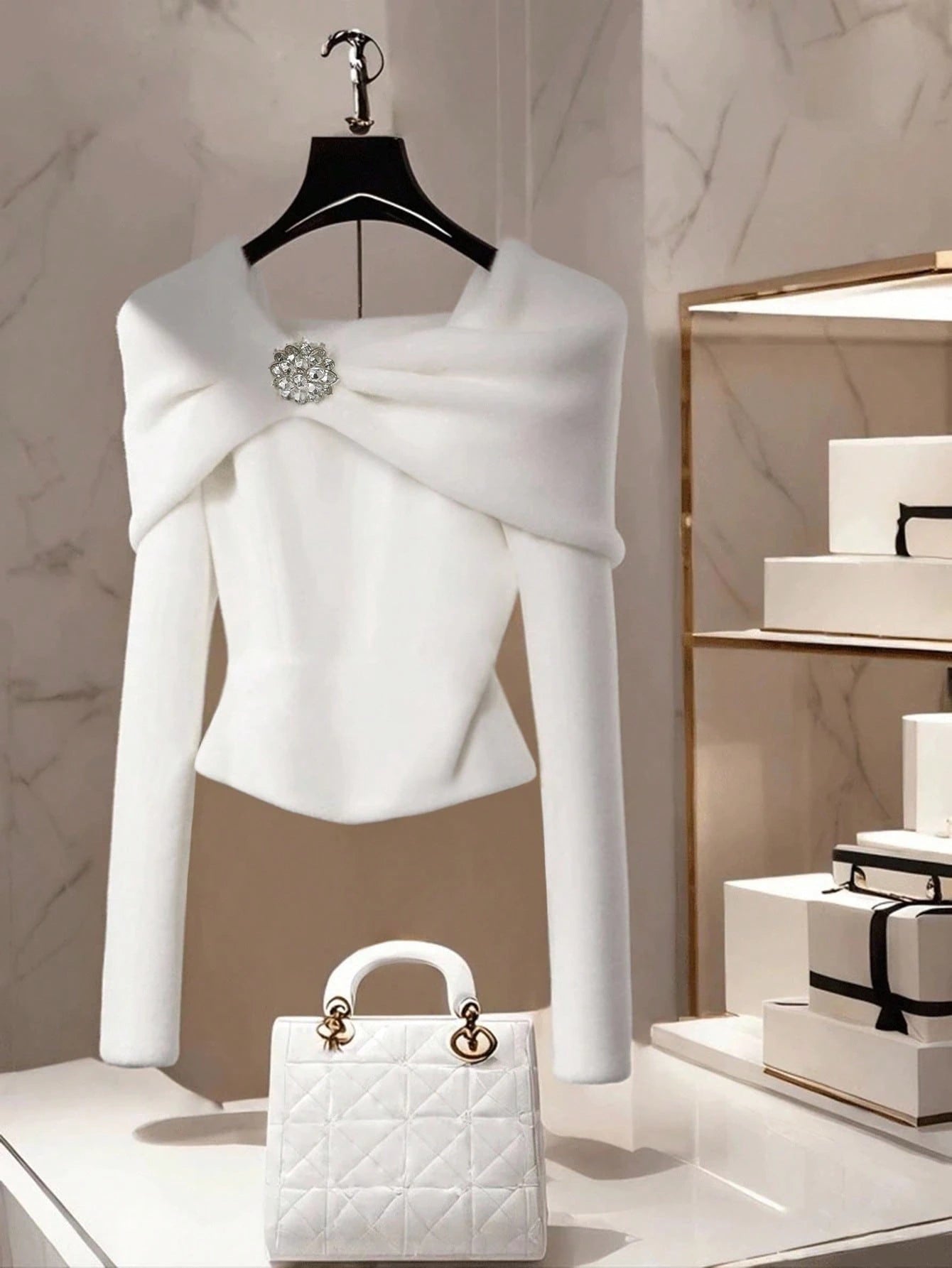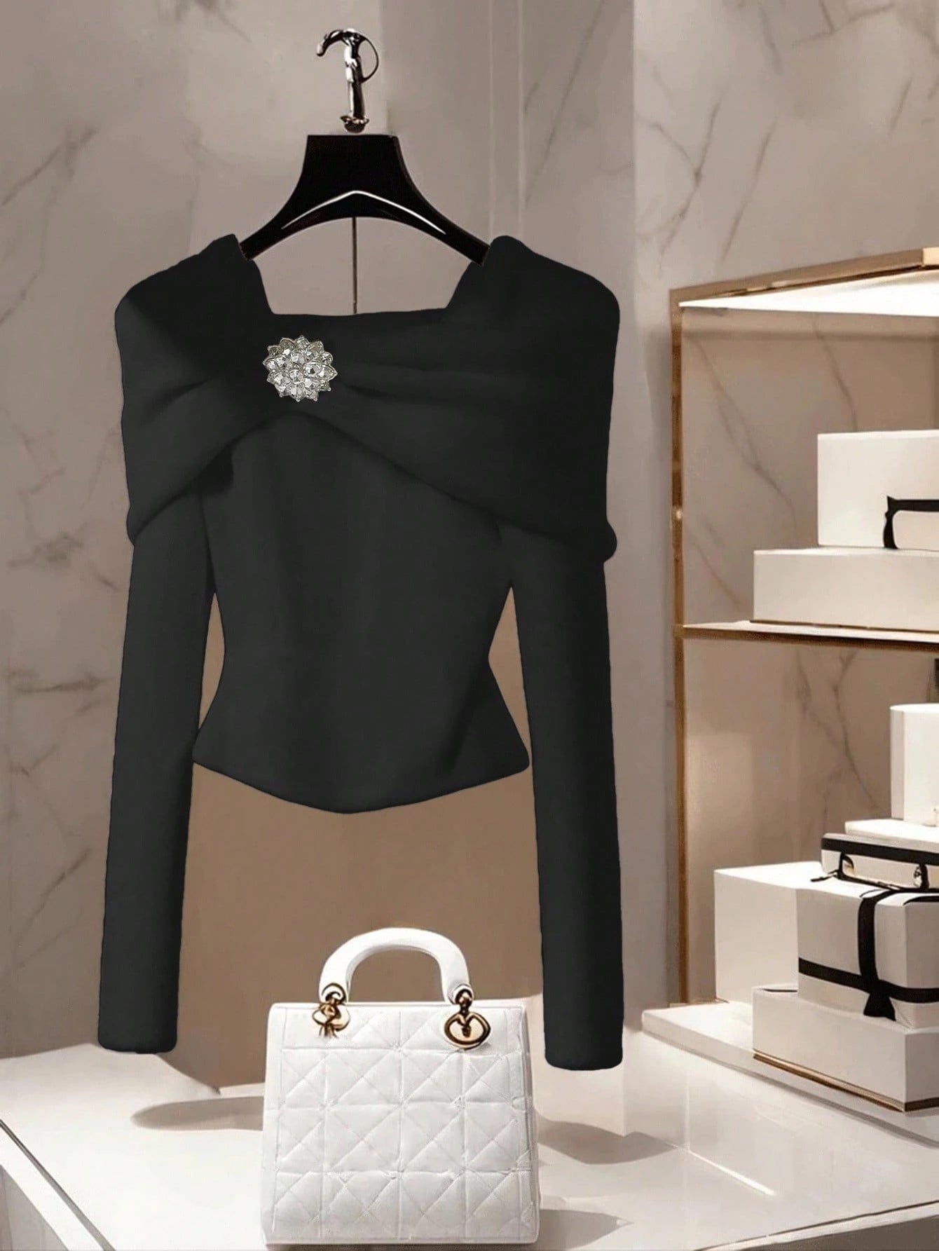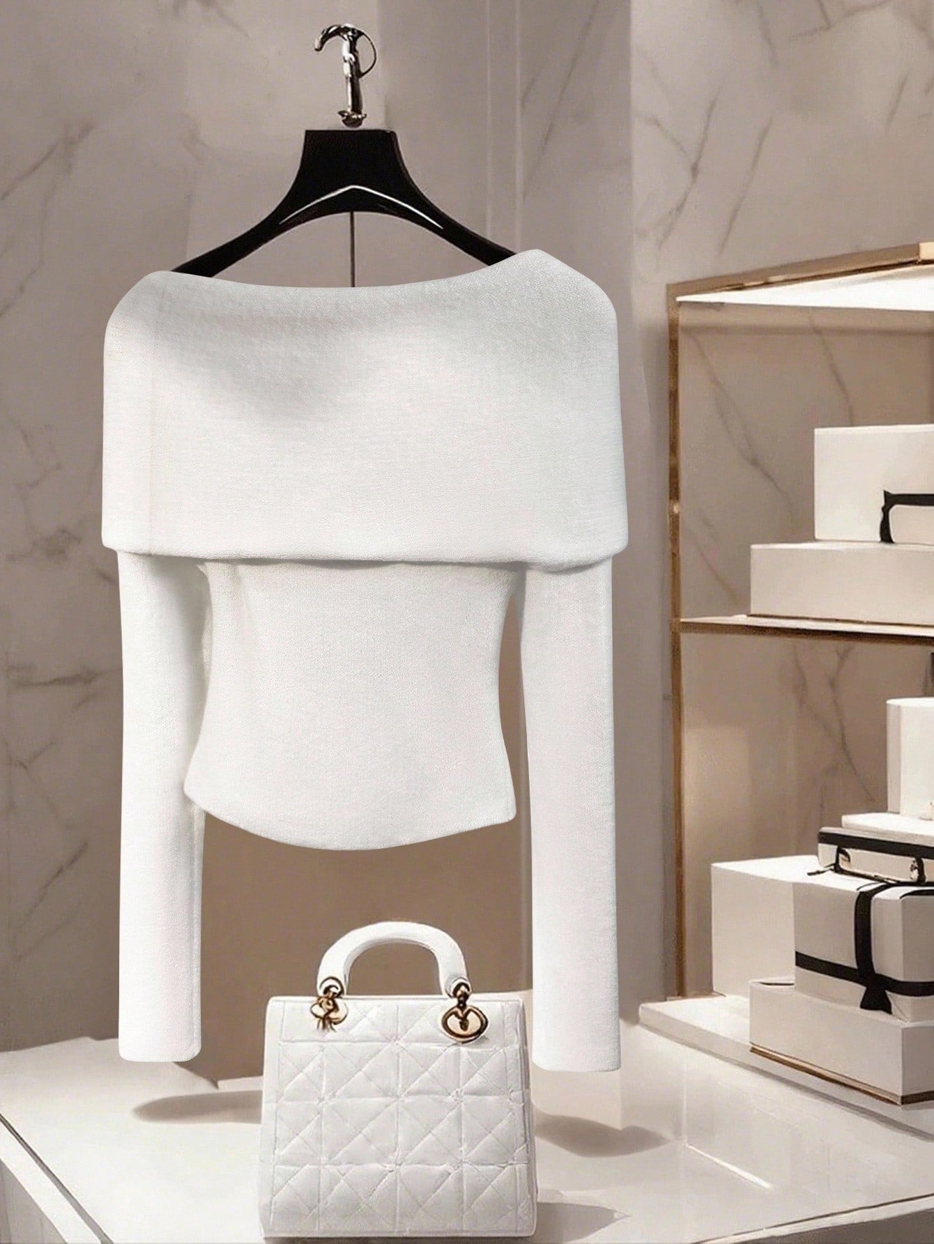 Women's Casual Solid Color Boat Neck One-Shoulder Long Sleeve Metal Decor Pullover Sweater