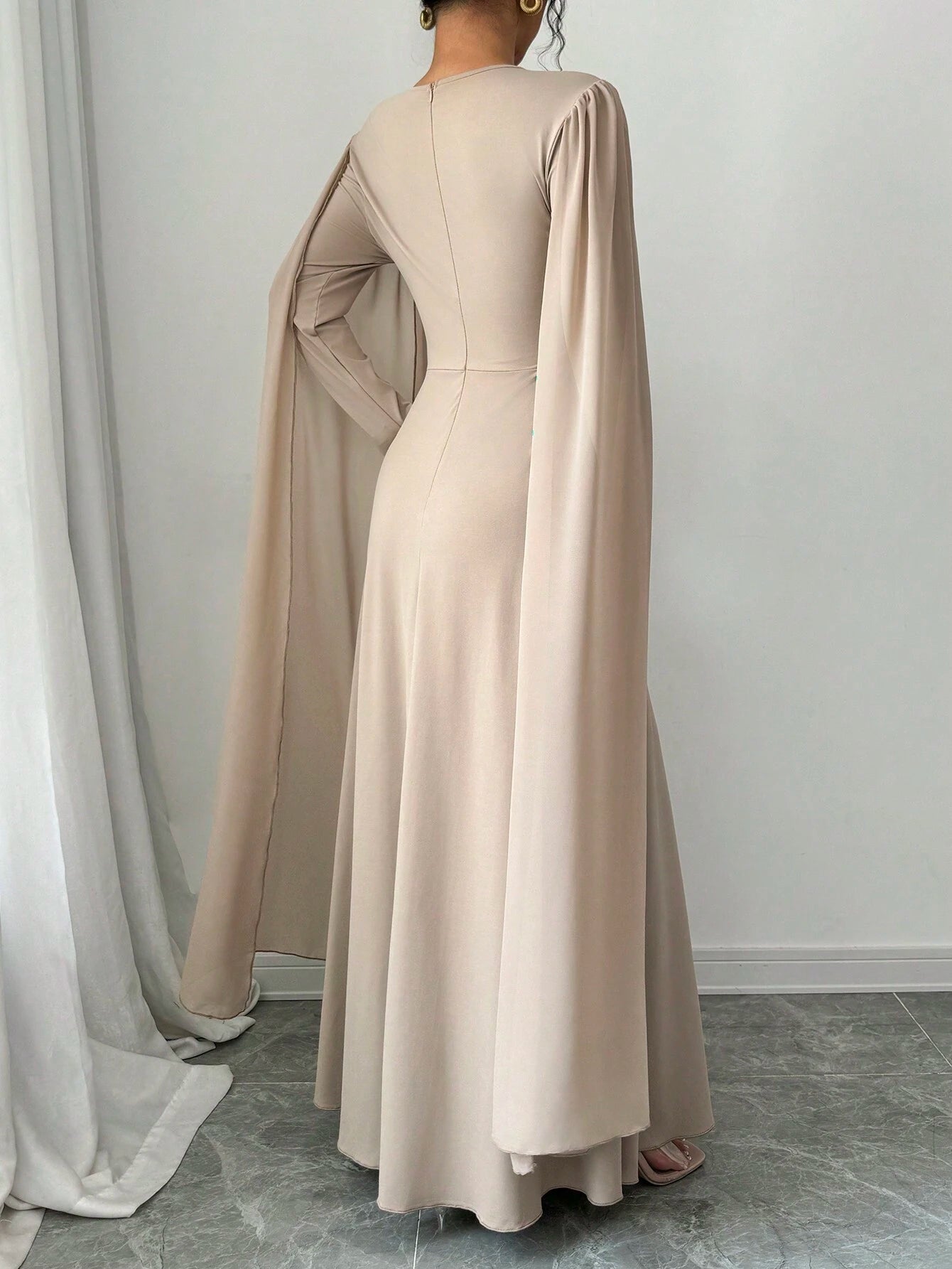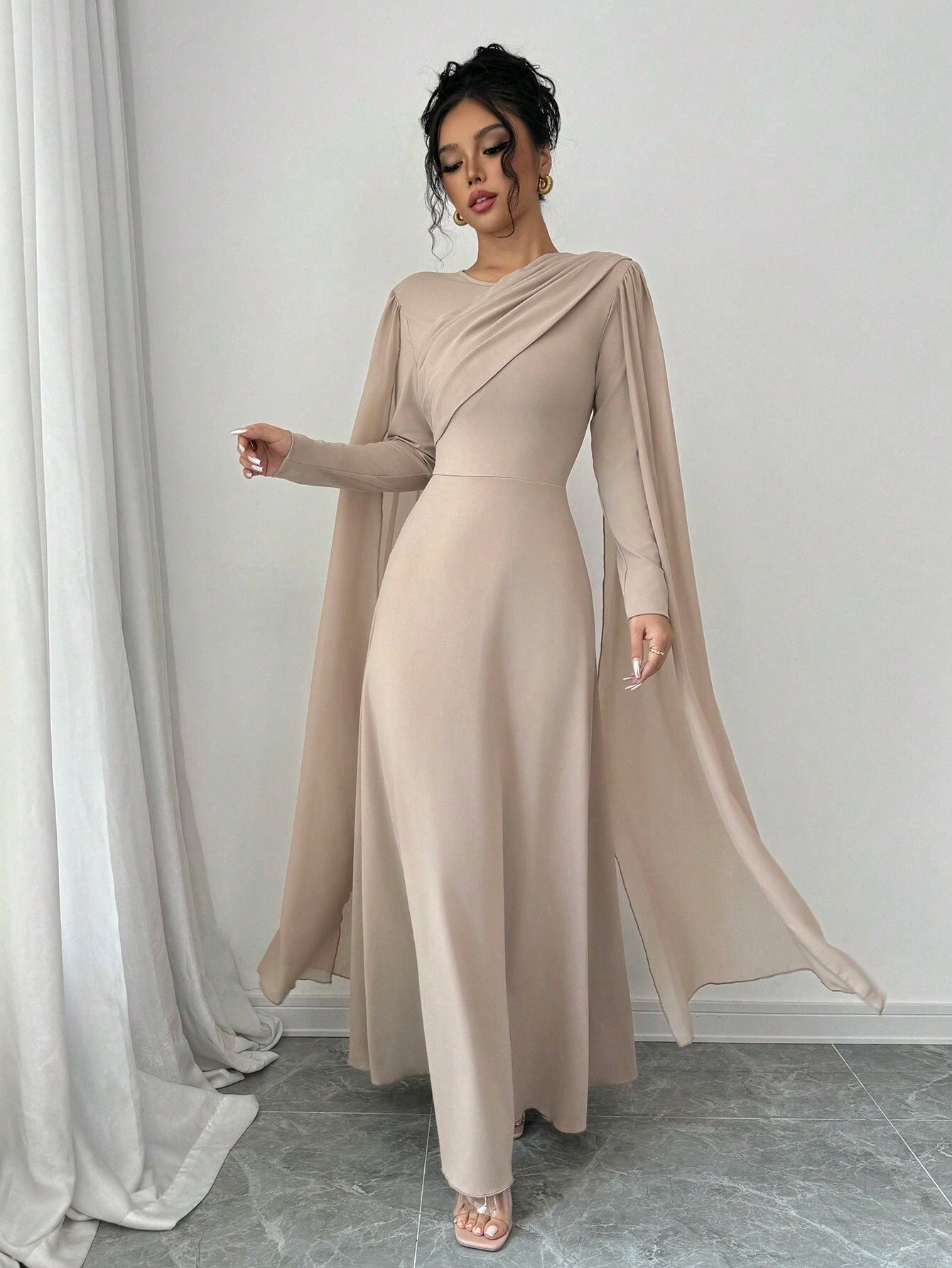 Women's Elegant Charming Party Long Sleeve Round Neck Waist Cinching Mesh Cape Solid Color Dress