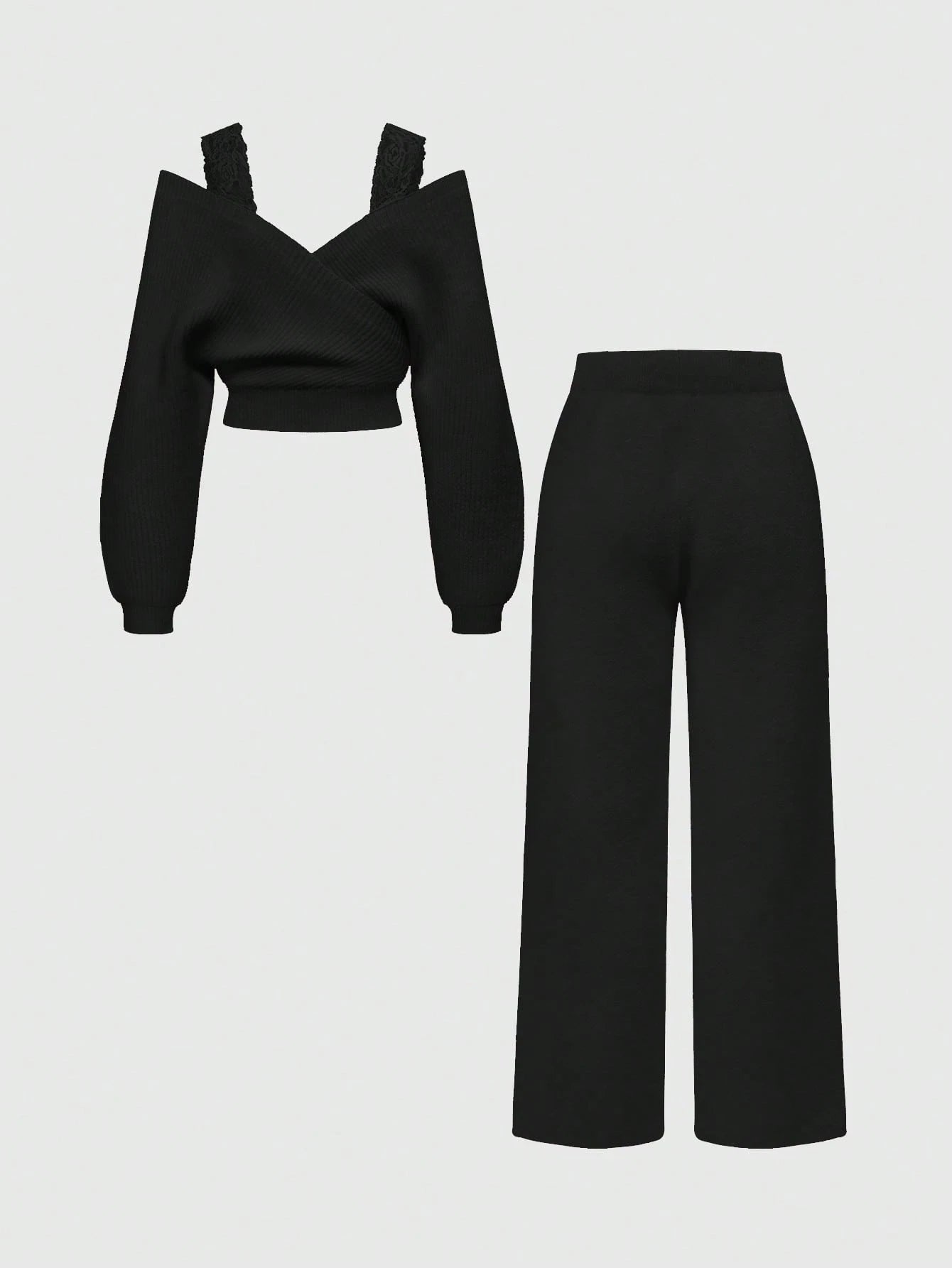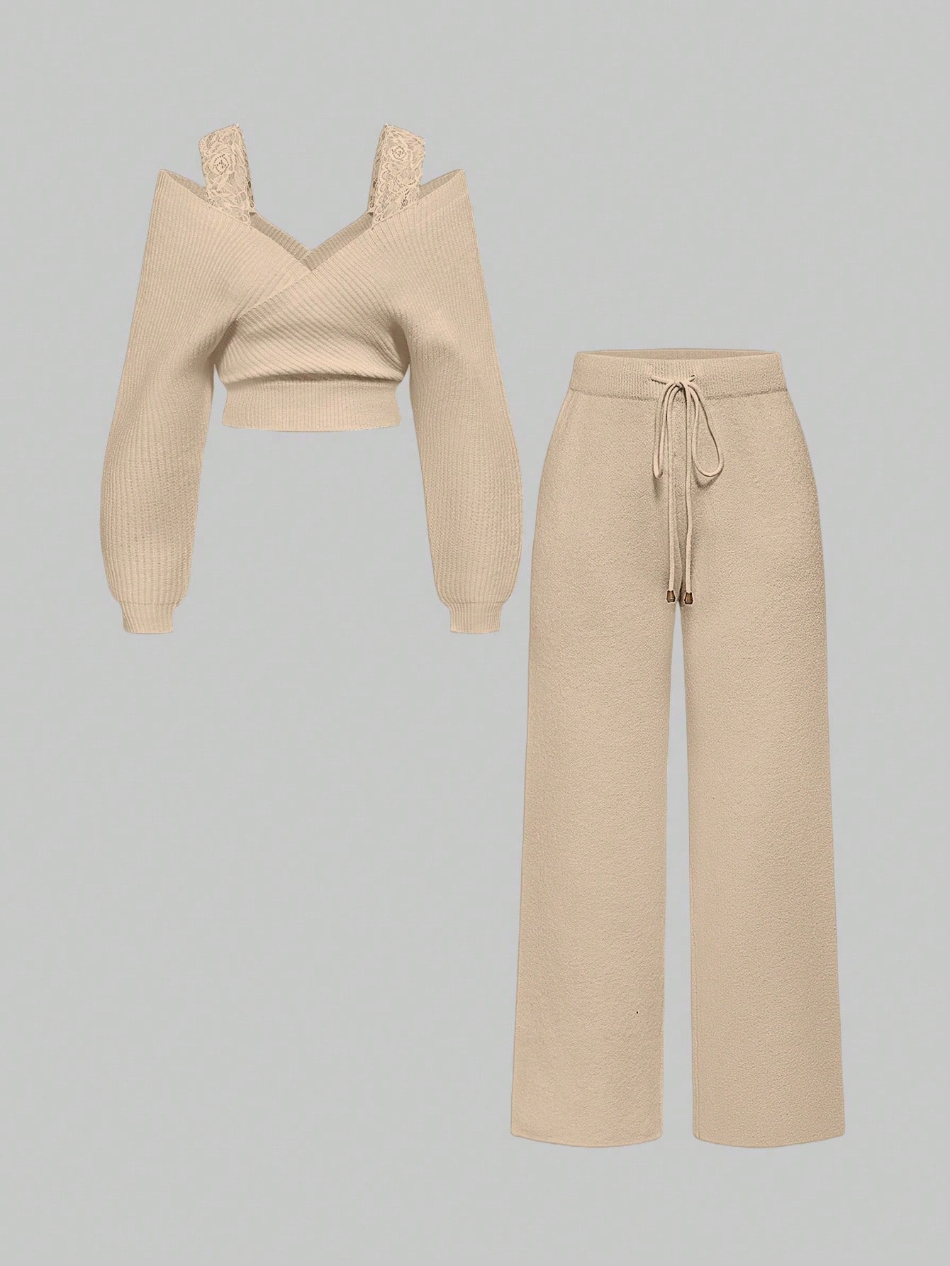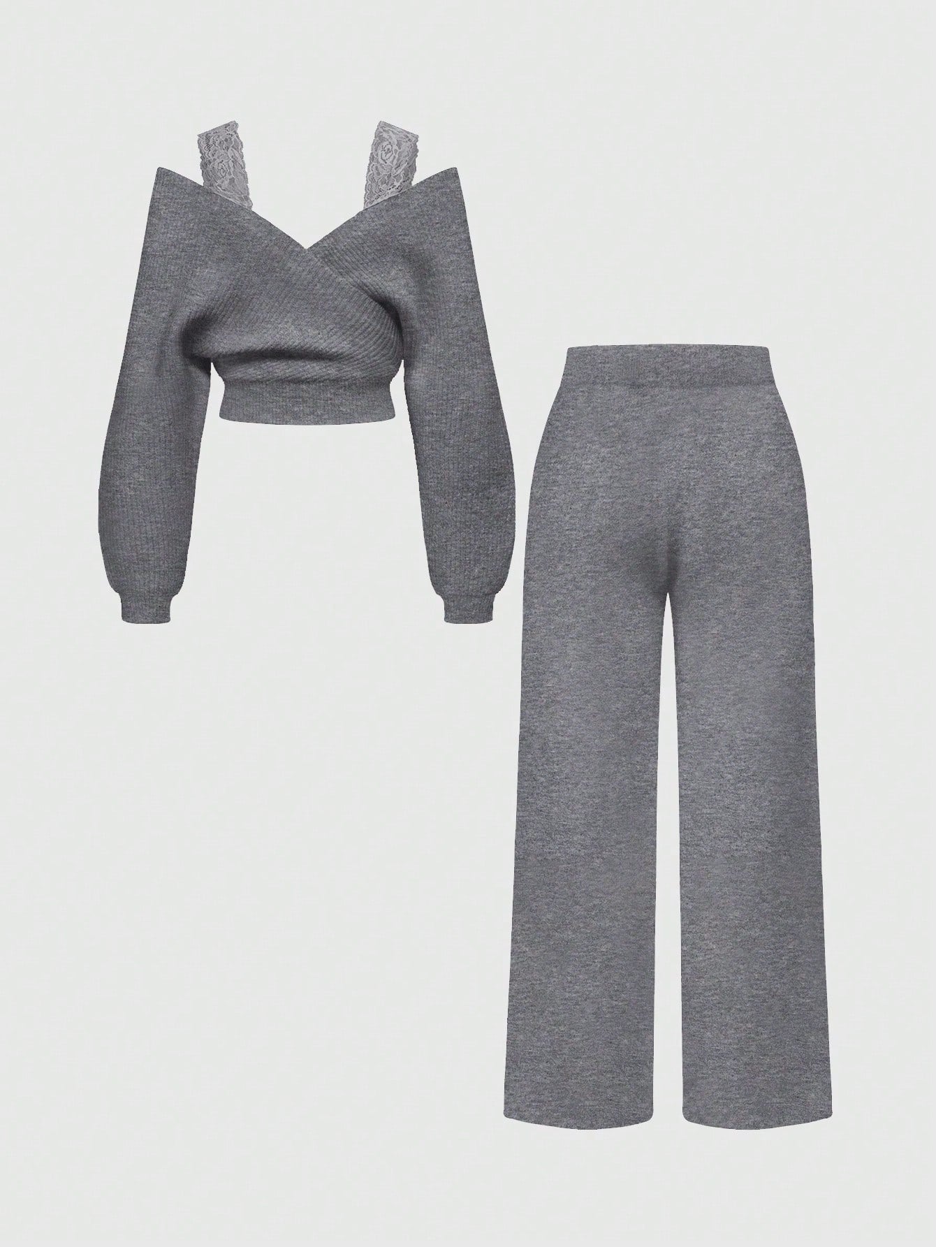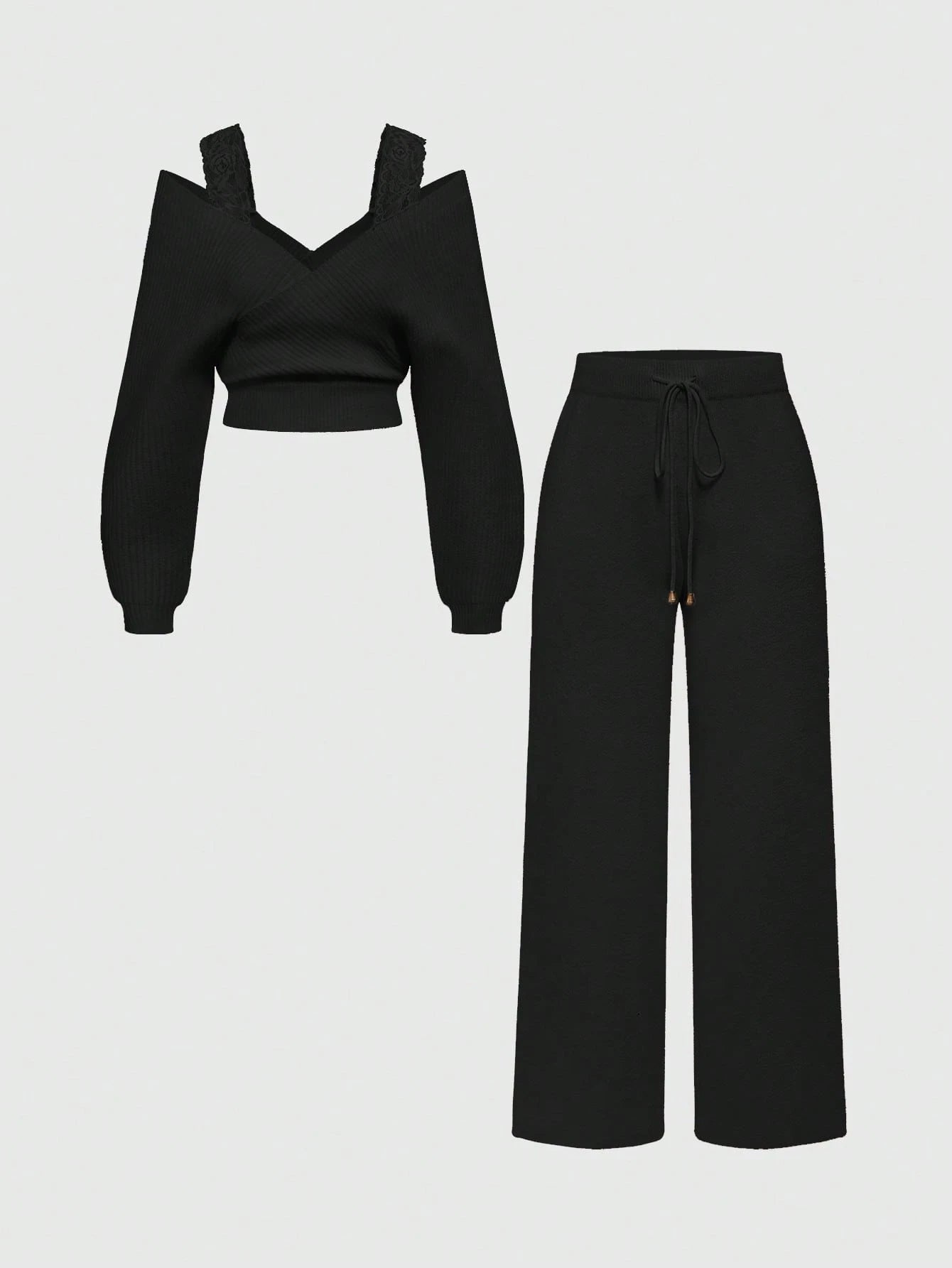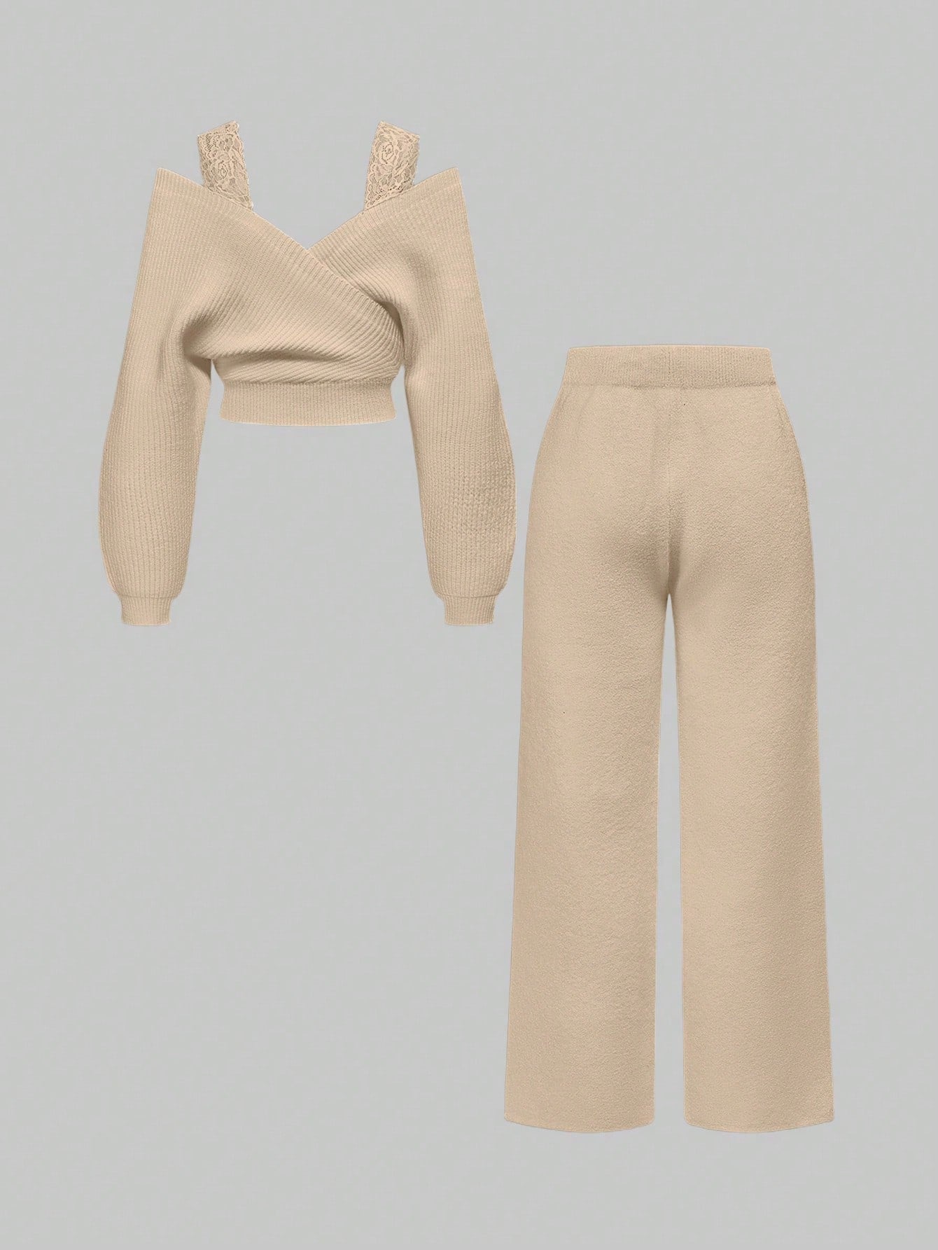 Women's Off-Shoulder V-Neck Lace Strap Loose Wide Leg Pants Knit Sweater Set