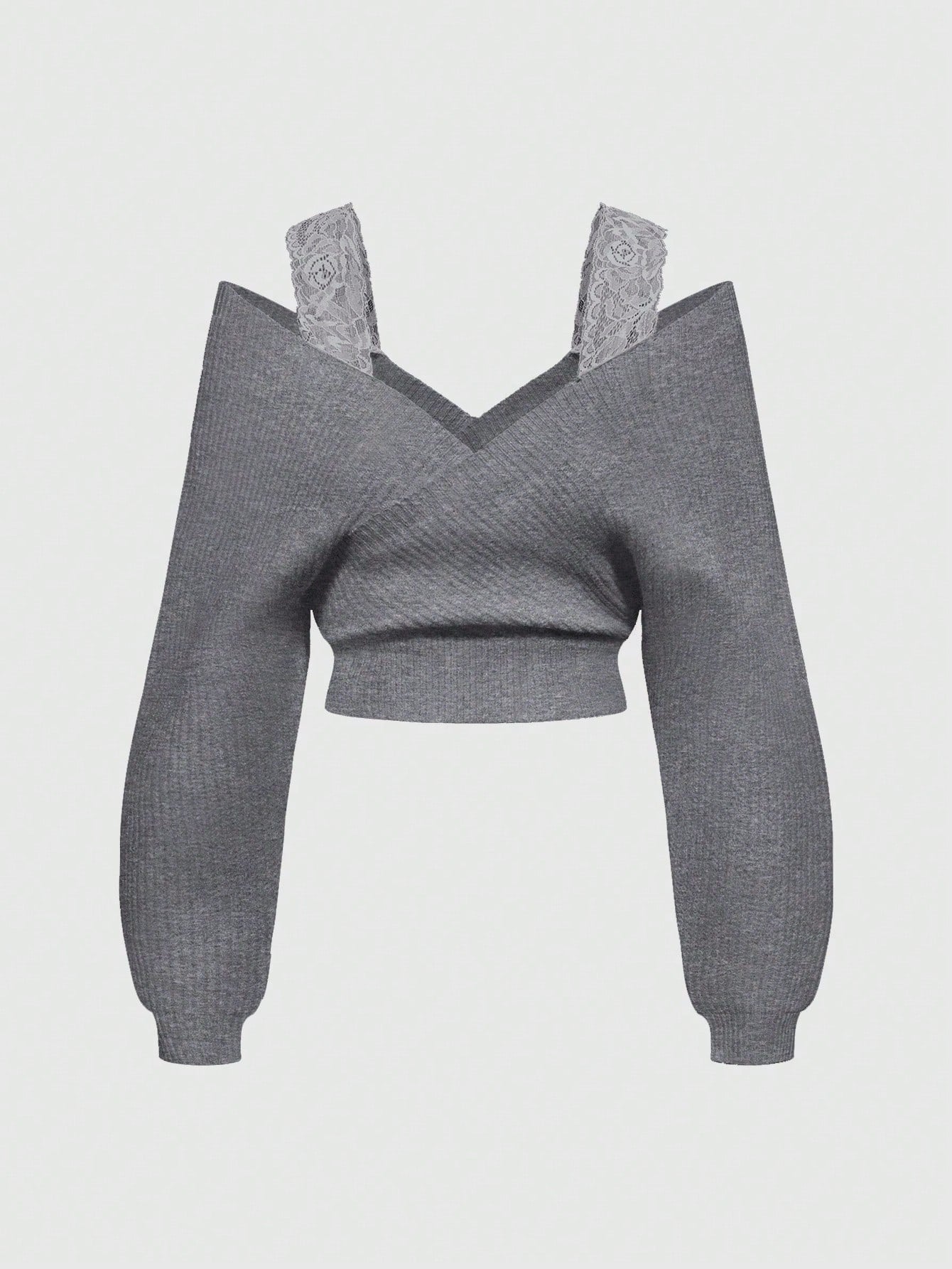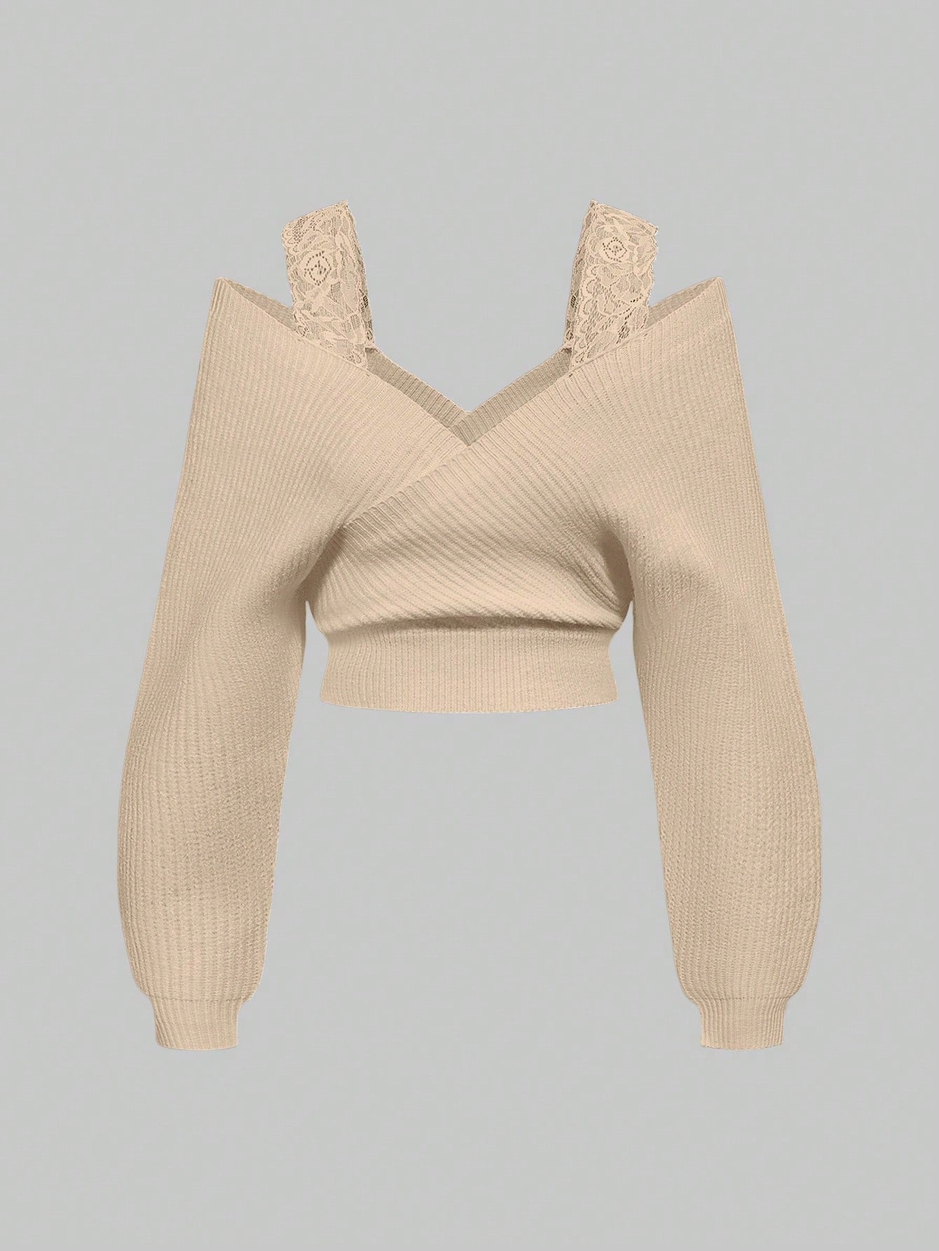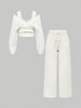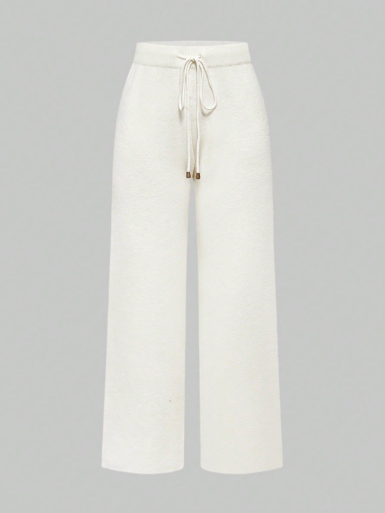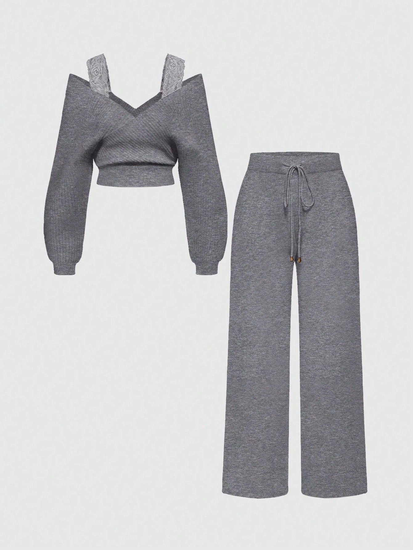 Women's Off-Shoulder V-Neck Lace Strap Loose Wide Leg Pants Knit Sweater Set