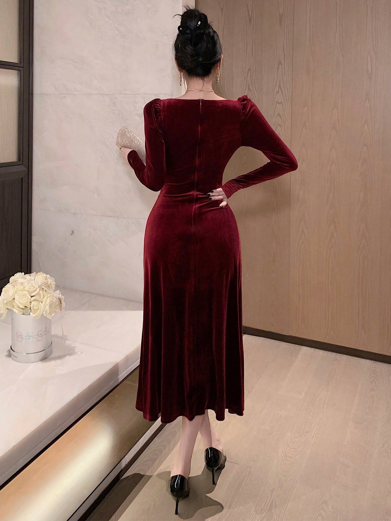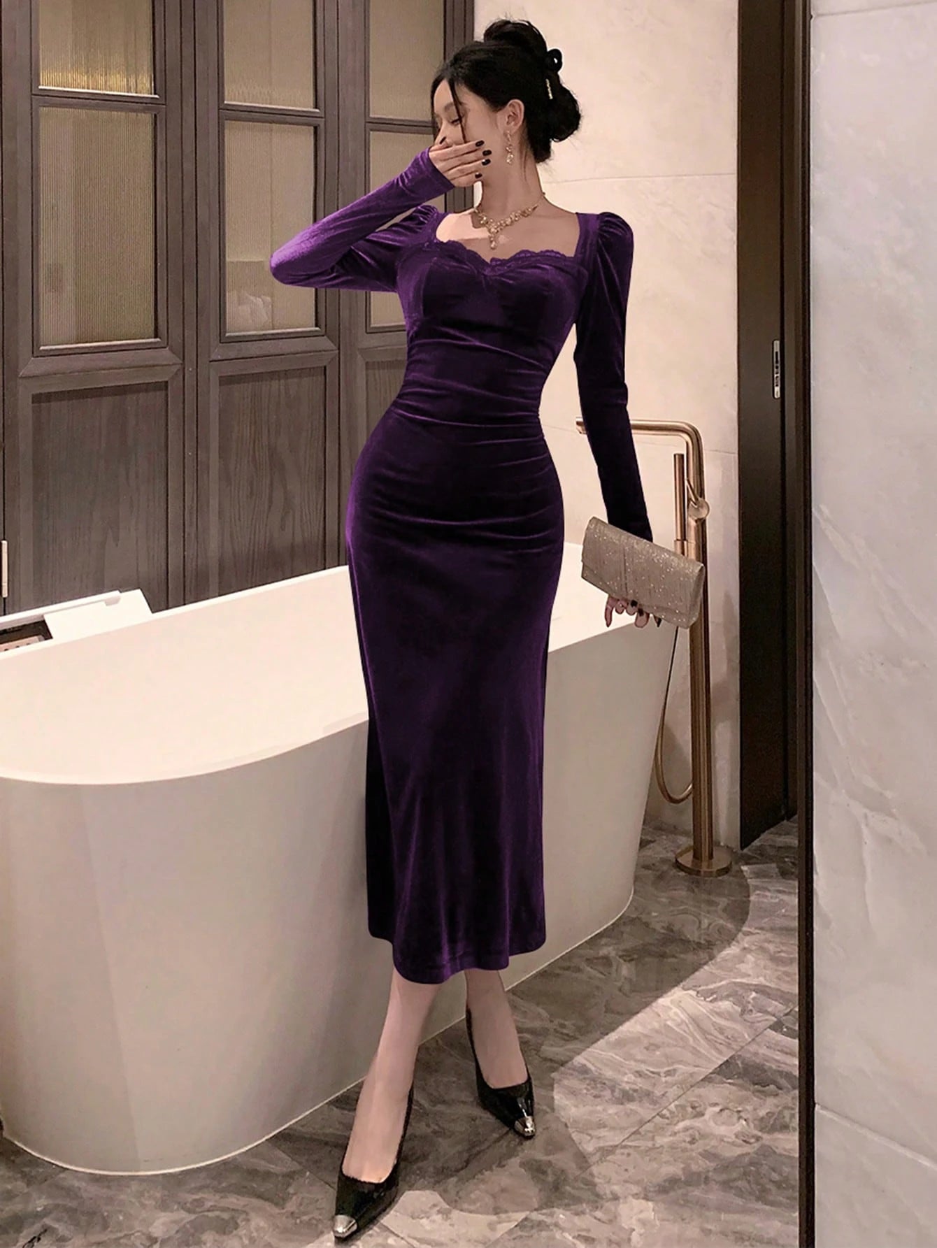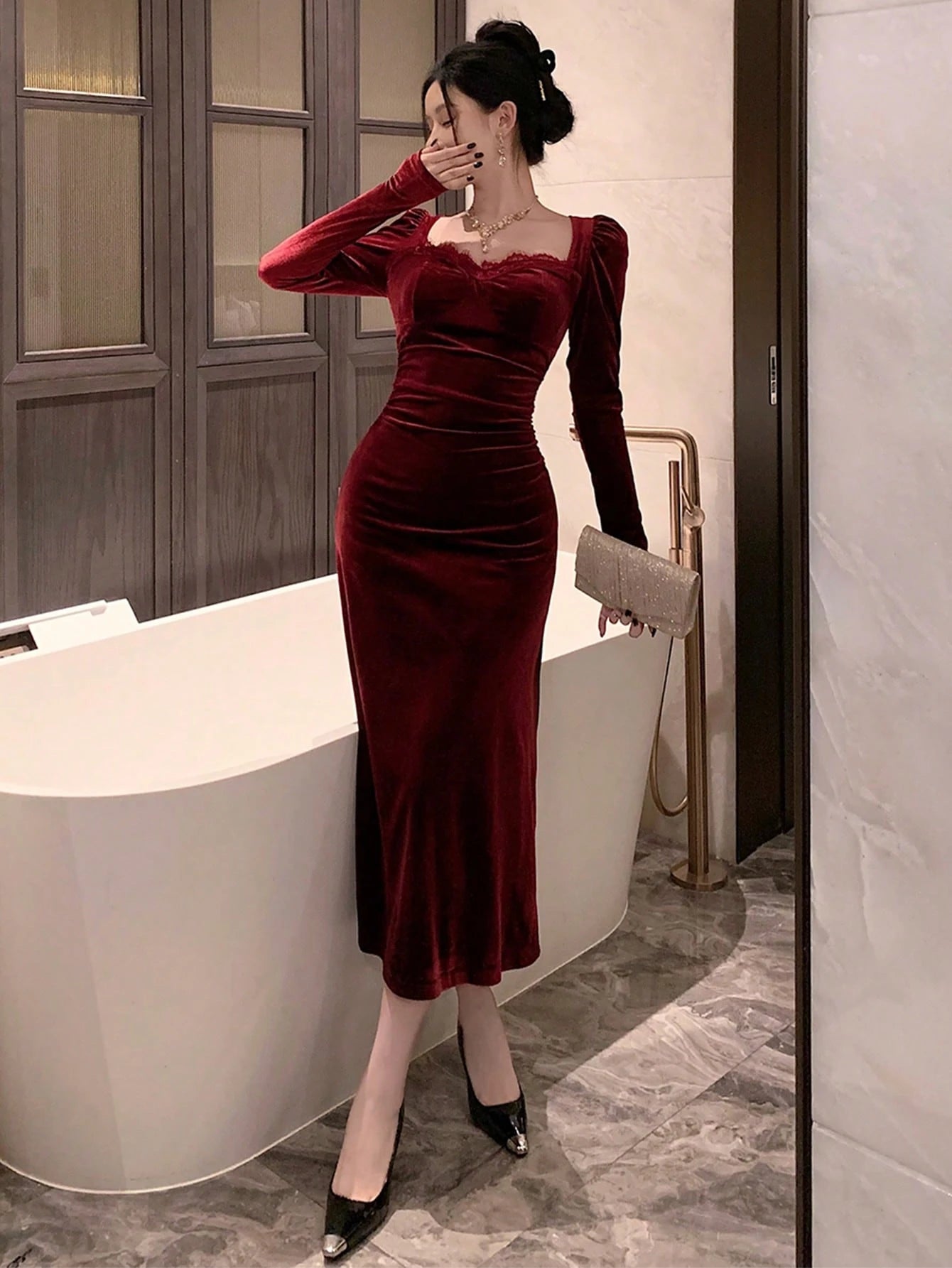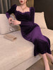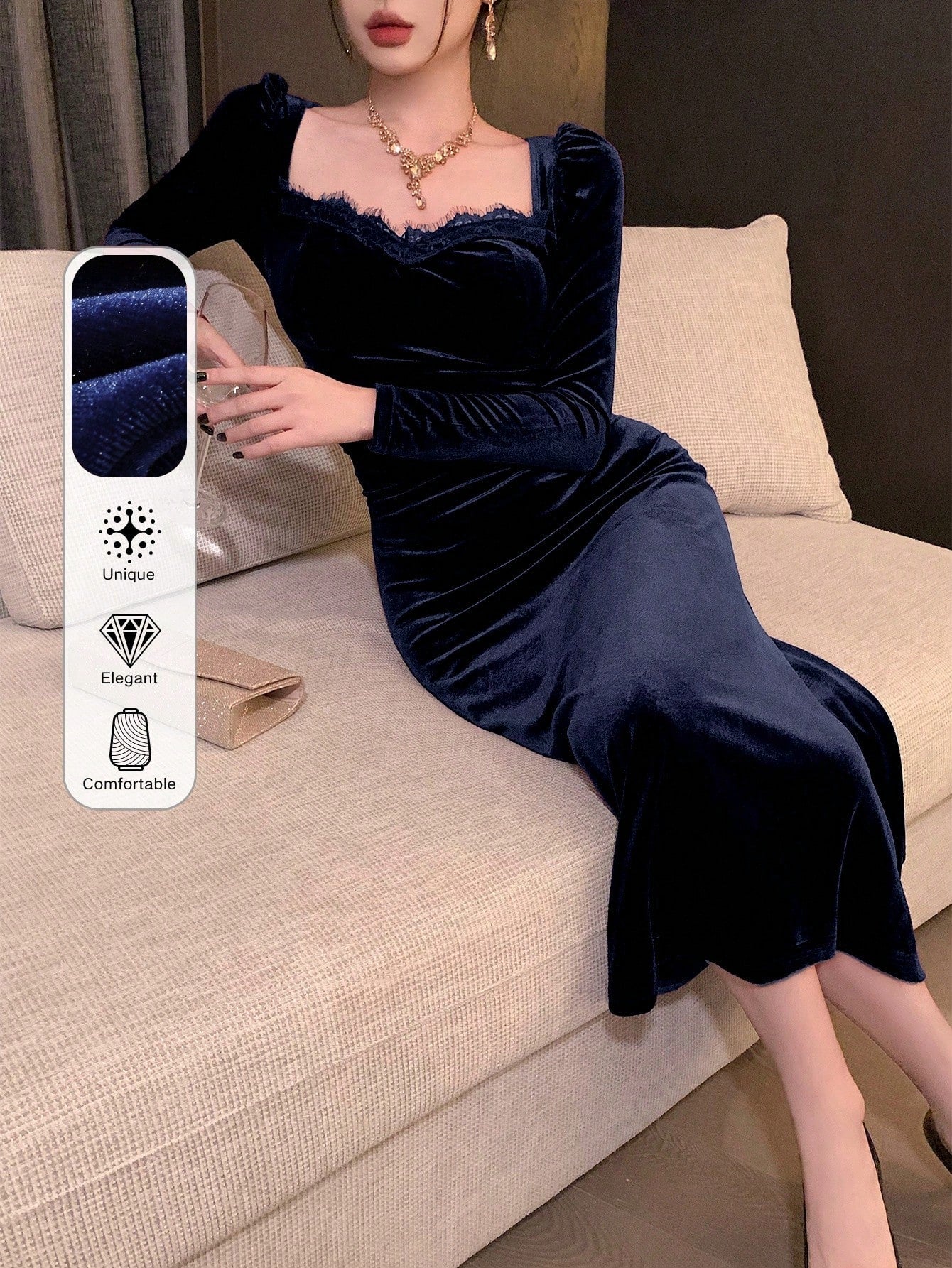Women's Solid Color Contrast Lace Sweetheart Neck Puff Sleeve Elegant Dress