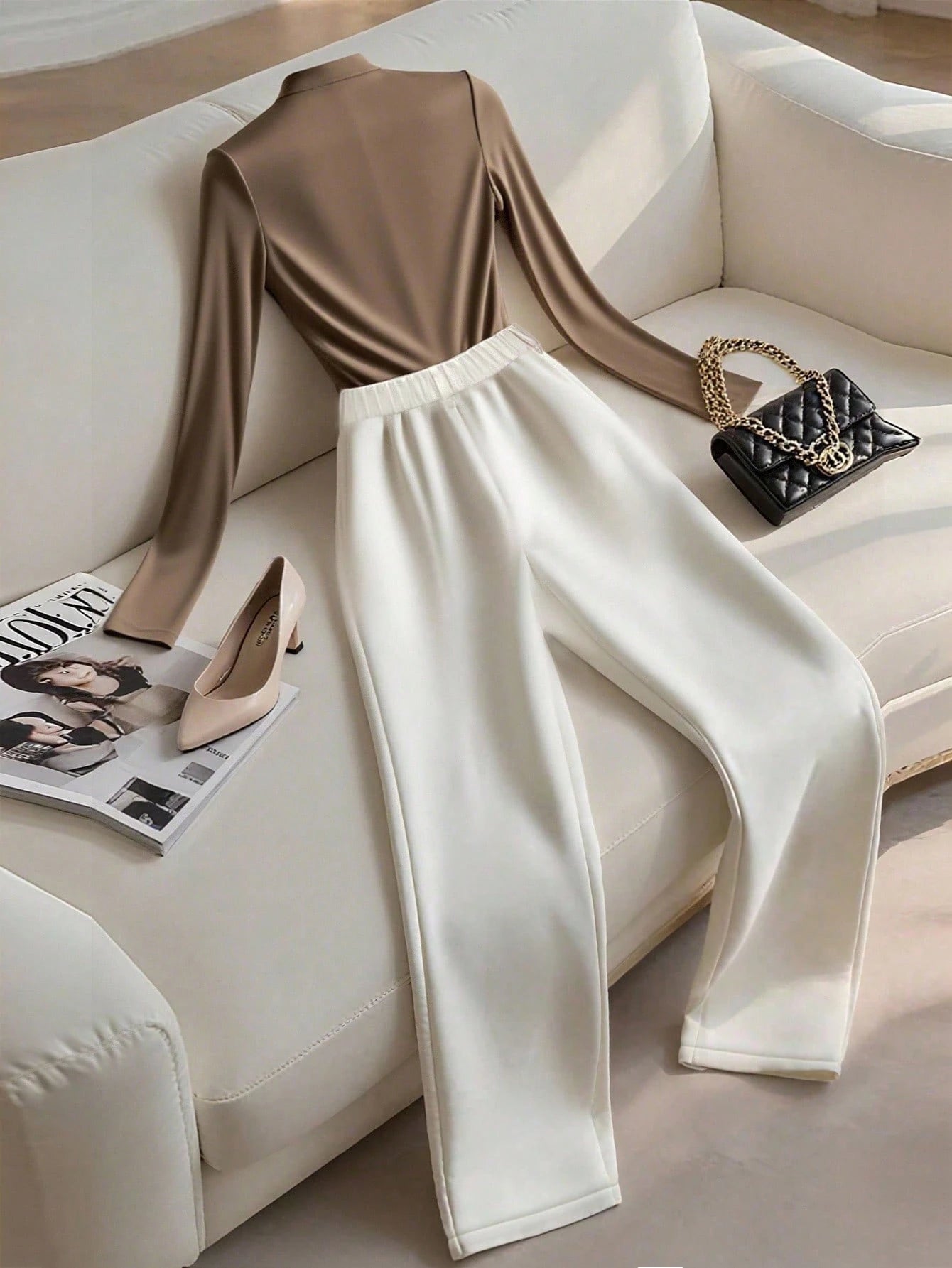 Women's Solid Color Round Neck Long Sleeve T-Shirt And Pleated Long Pants