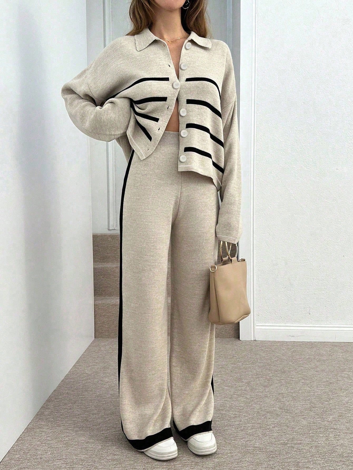 Women's Striped Drop Shoulder Long Sleeve Single-Breasted Knit Cardigan And Knit Pants