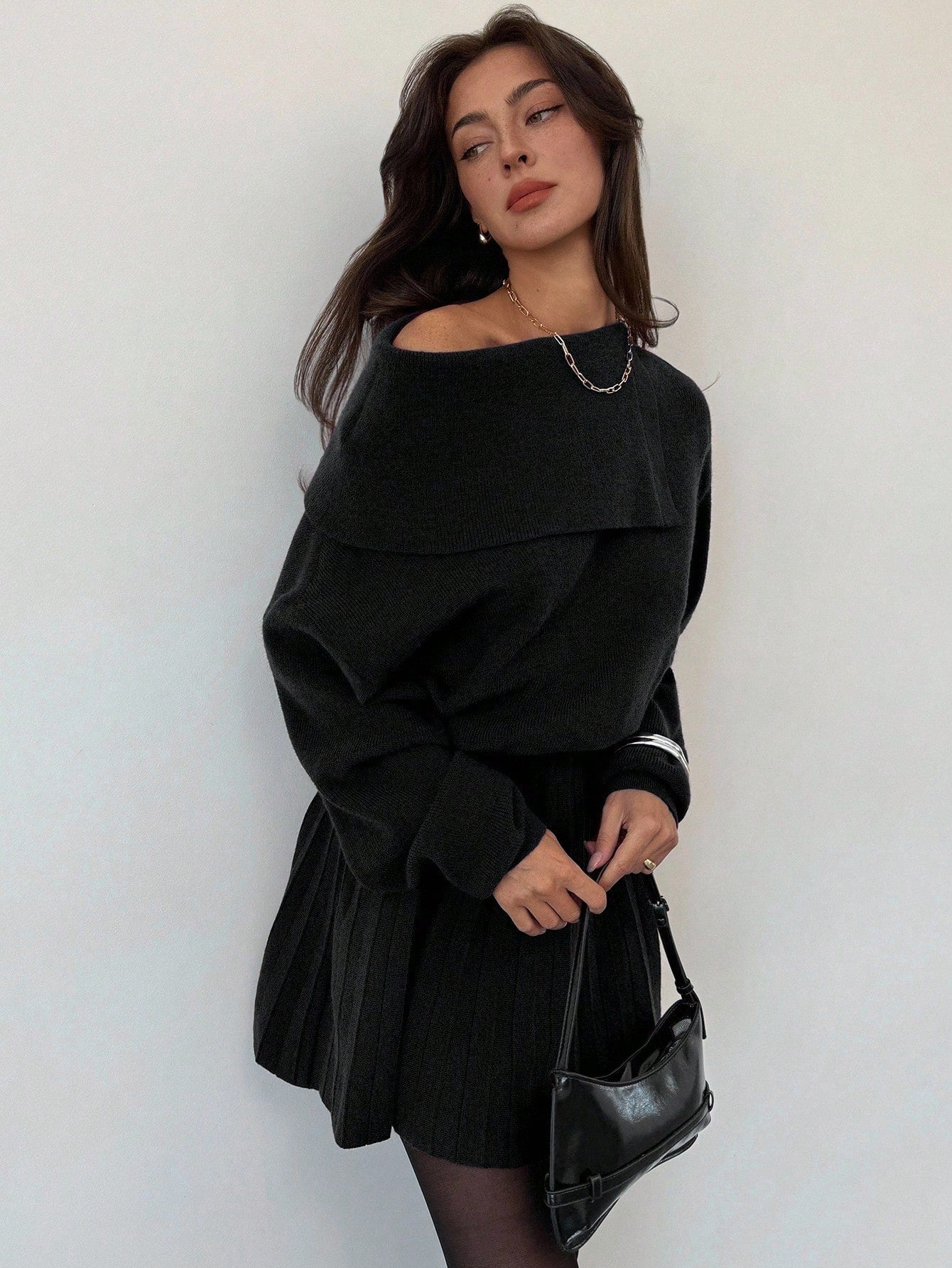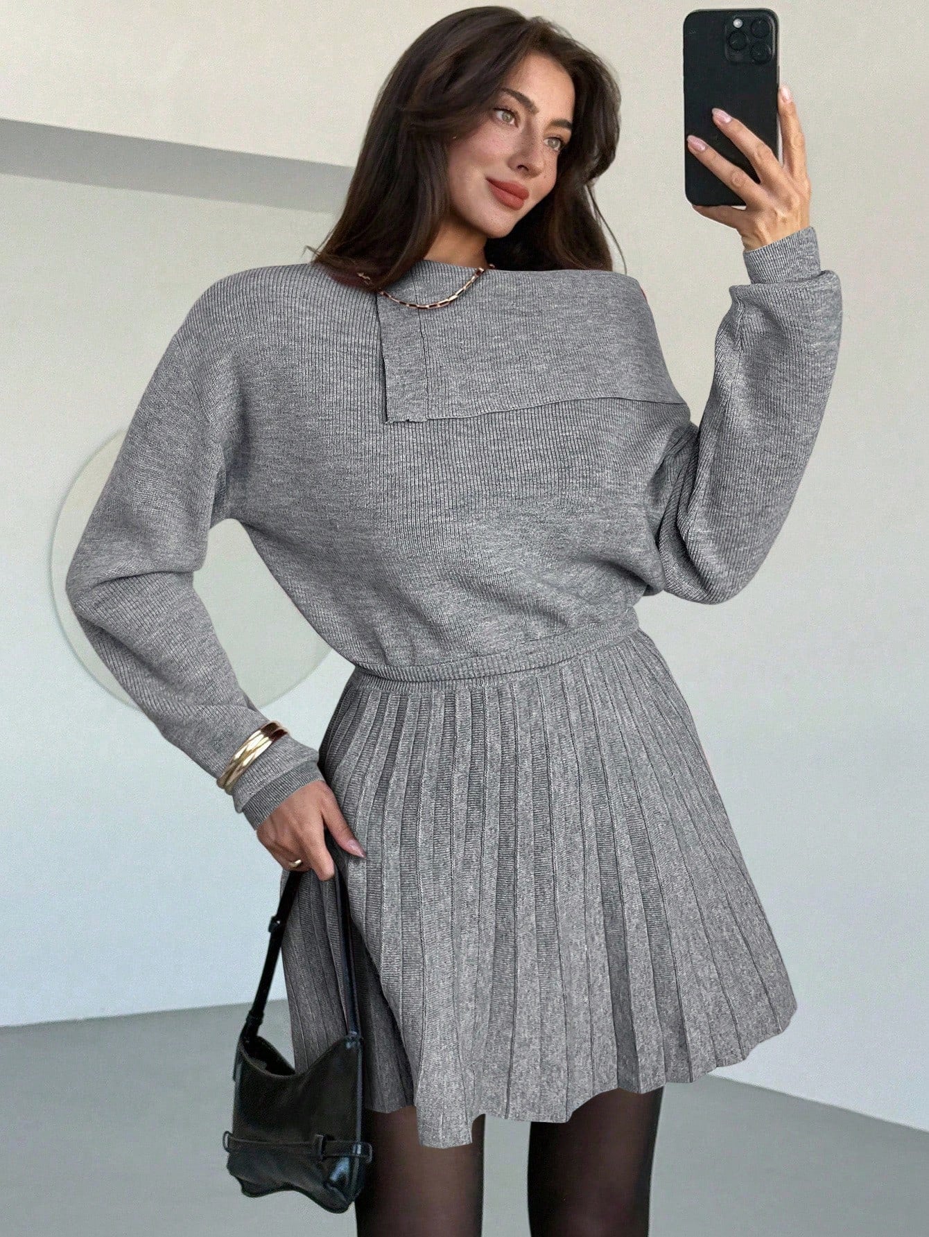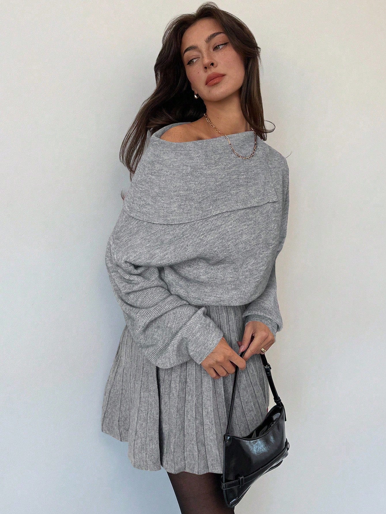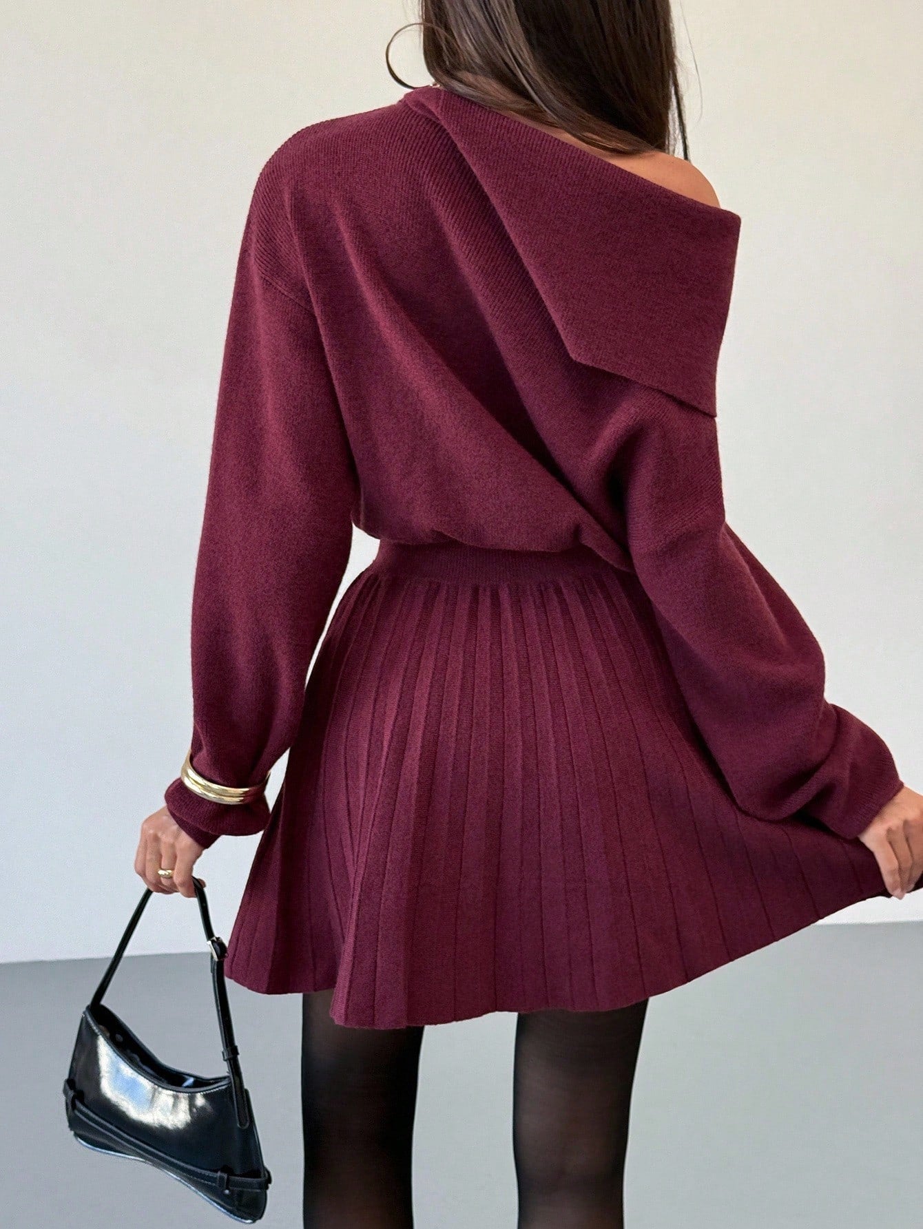 Women's Wine Red Woolen Dress Waist Pleated A-Line Slim Knitted Dress